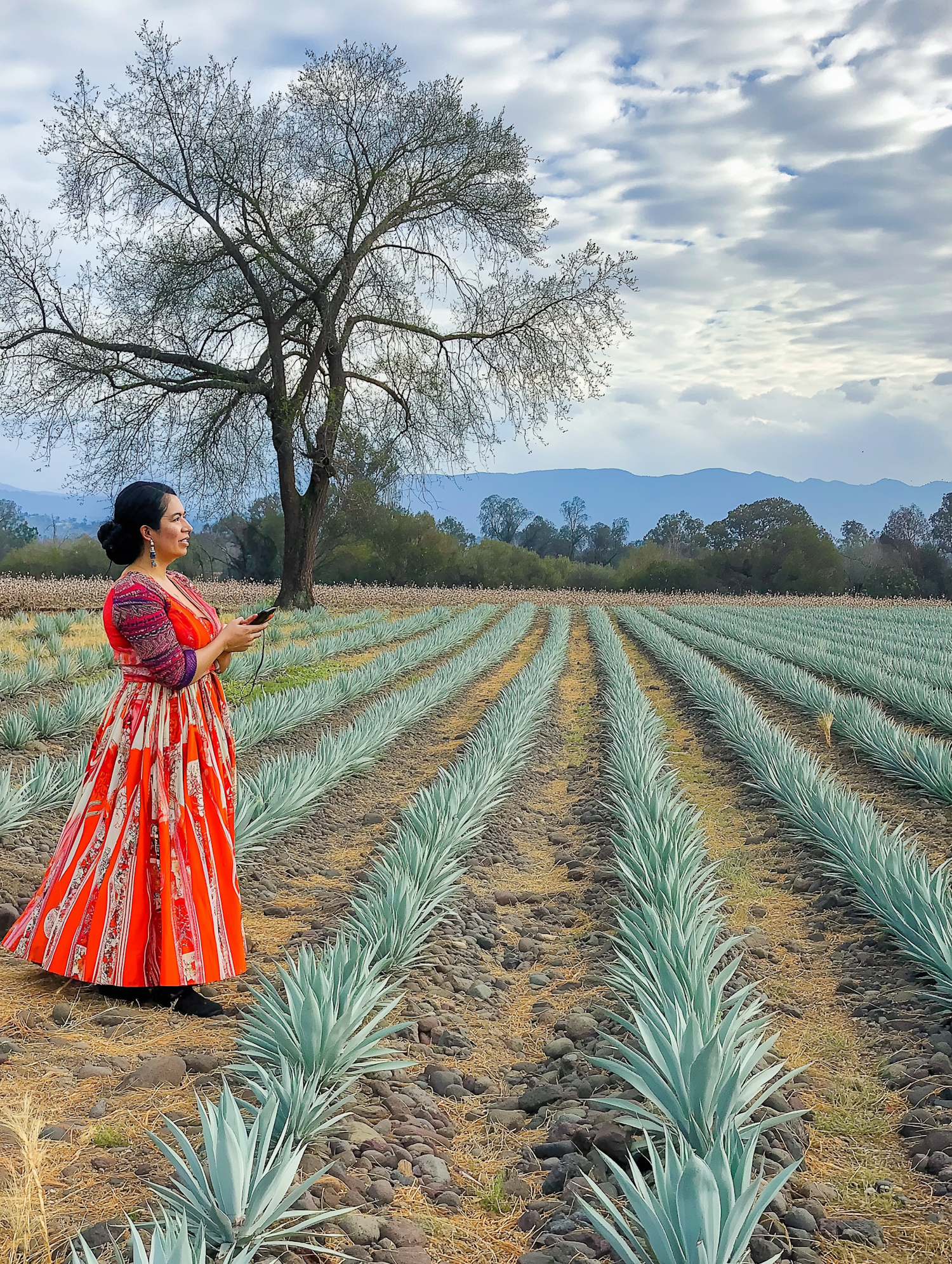 Woman in a vibrant red dress stands in an agave field, holding a smartphone, with mountains and a cloudy sky in the background.
