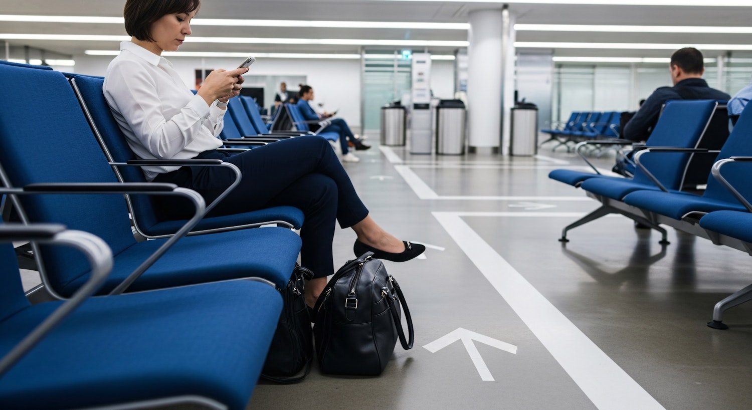 A woman seated in an airport lounge, engrossed in her phone, with blue chairs and directional arrows on the floor around her.