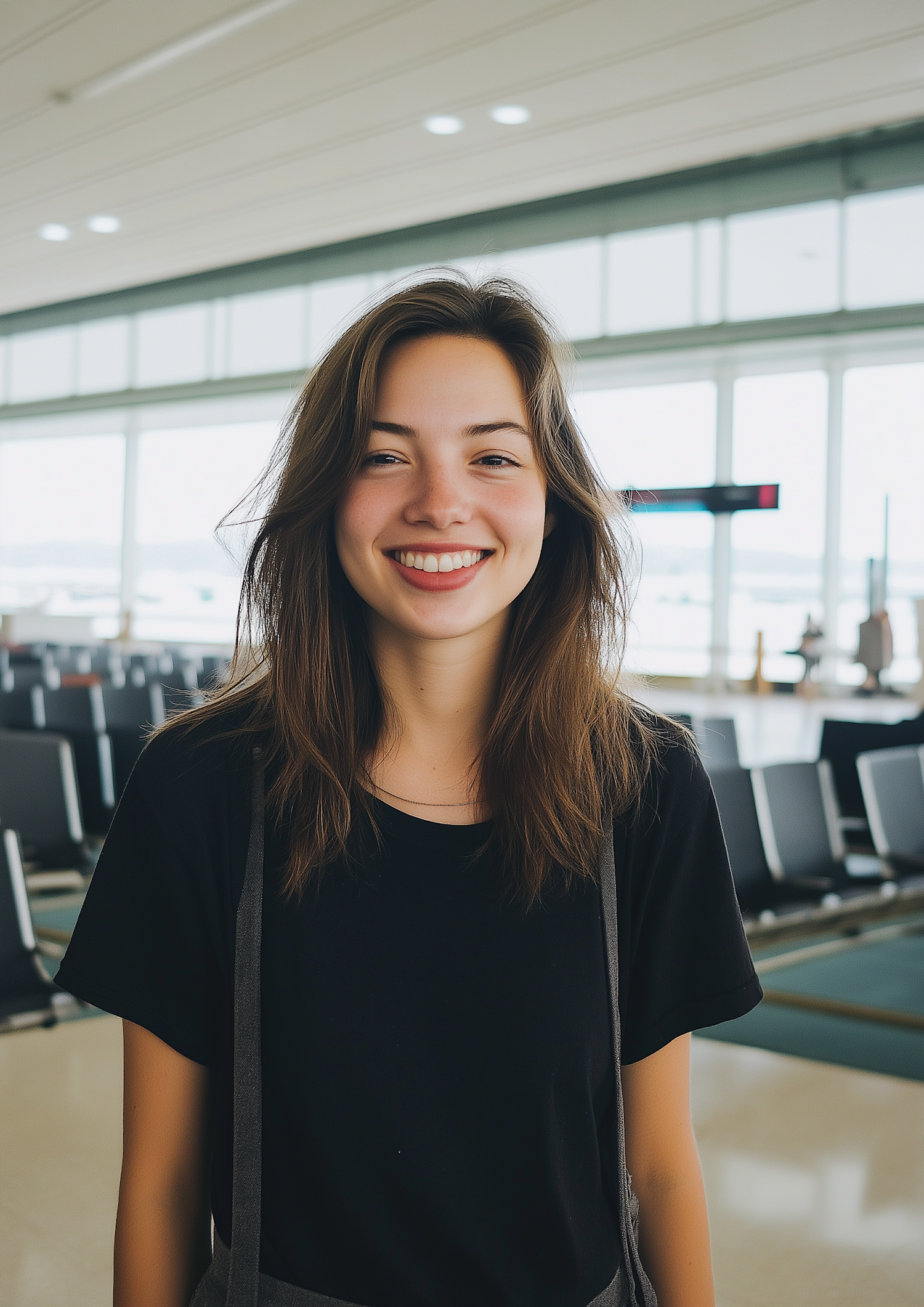 Smiling young woman with light brown hair in a bright airport terminal, wearing a black t-shirt and gray suspenders.