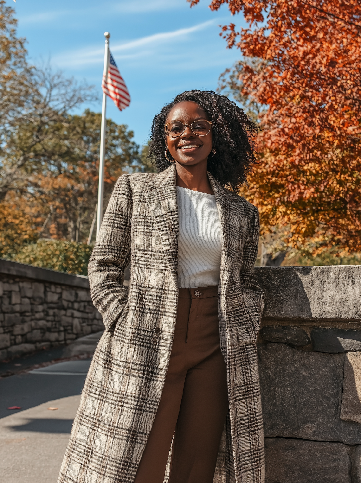 Stylish woman in plaid coat with autumn backdrop and American flag, exuding confidence and warmth on a sunny fall day.