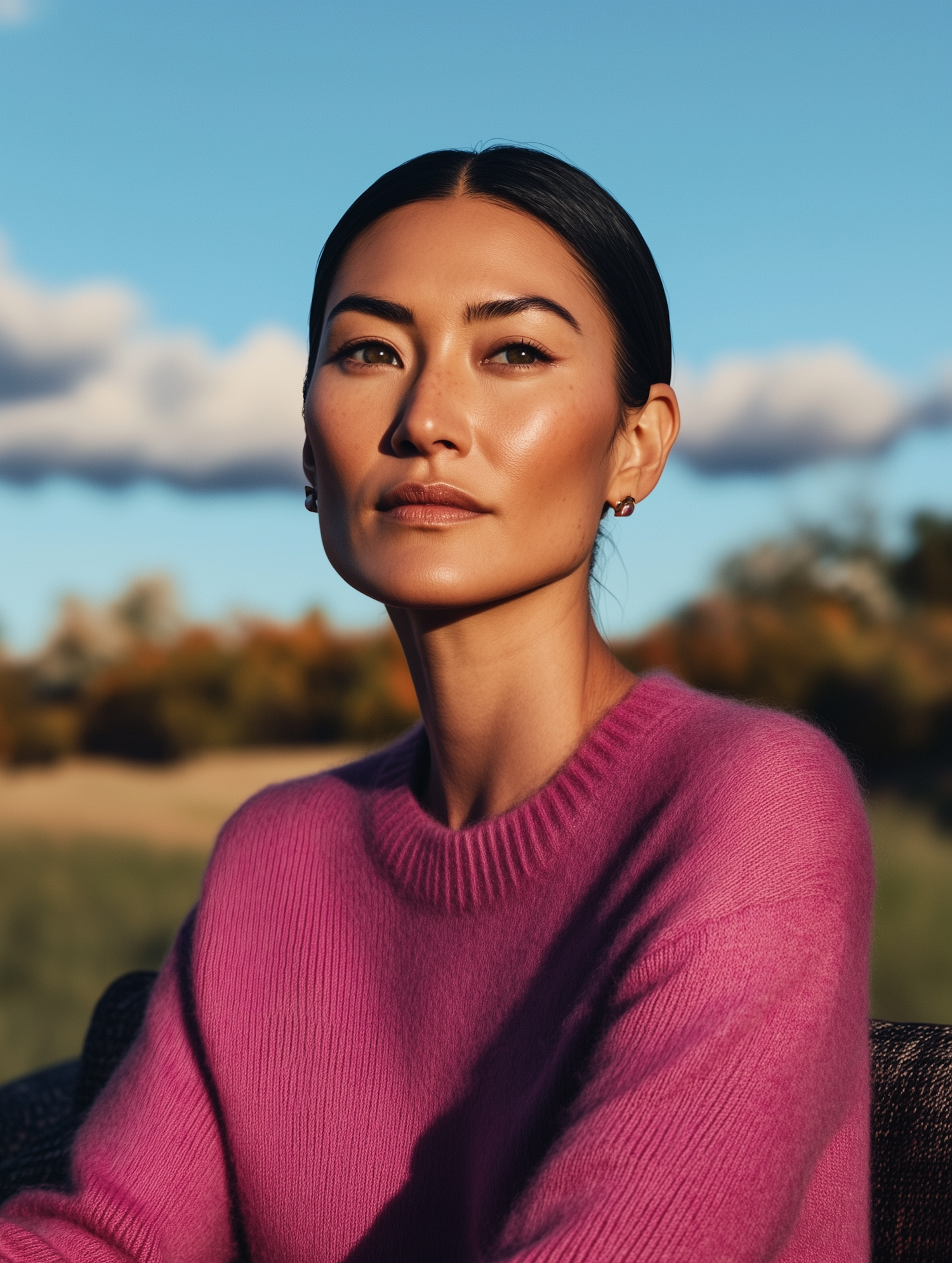 A serene portrait of a woman in a pink sweater outdoors, with a blurred autumnal background and a bright blue sky.
