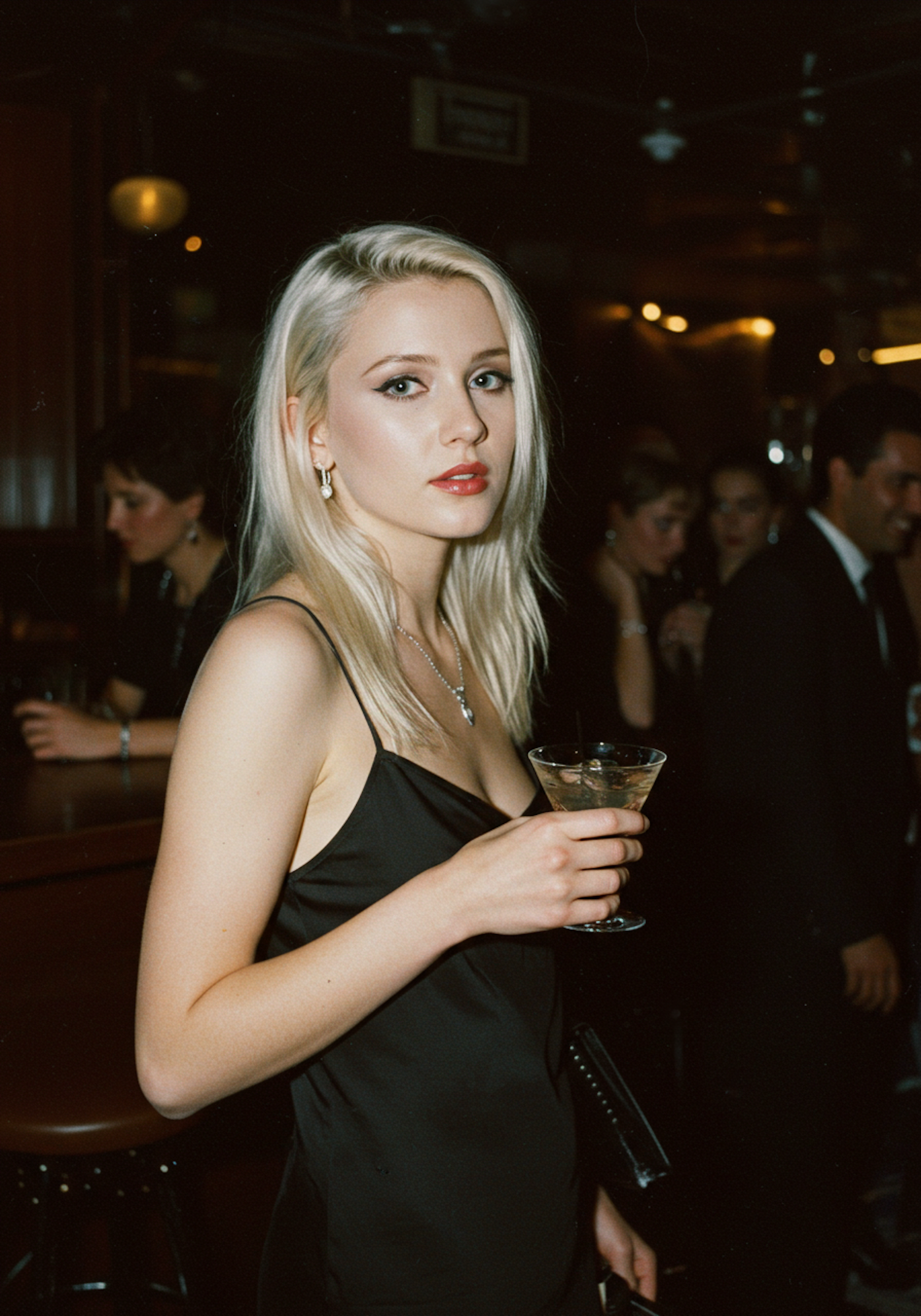 A blonde woman in a black dress holding a martini in a dimly lit bar, with a lively crowd in the background.