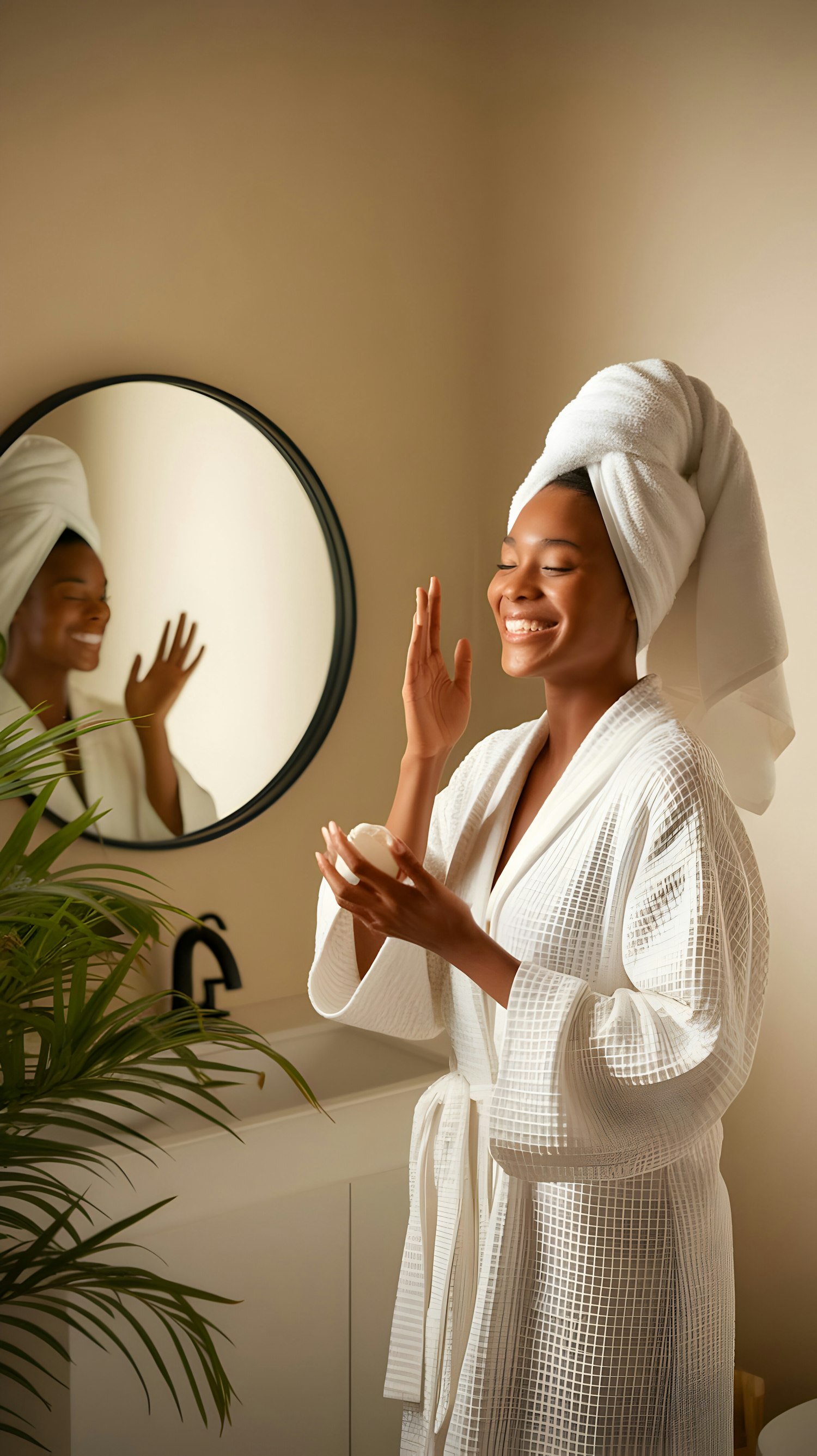 A woman in a white robe applies skincare in a serene bathroom with a round mirror and green plant, radiating self-care vibes.