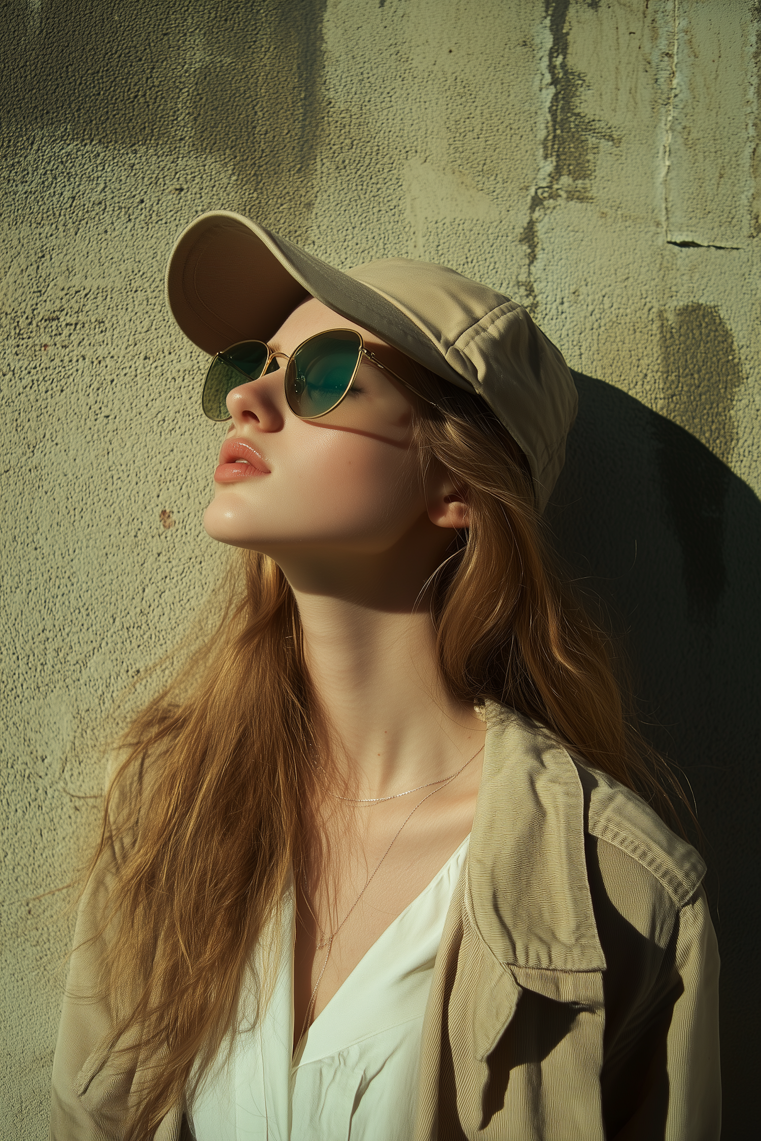 Stylish woman in sunglasses and cap against a textured wall, bathed in warm sunlight, exuding a serene and contemplative vibe.