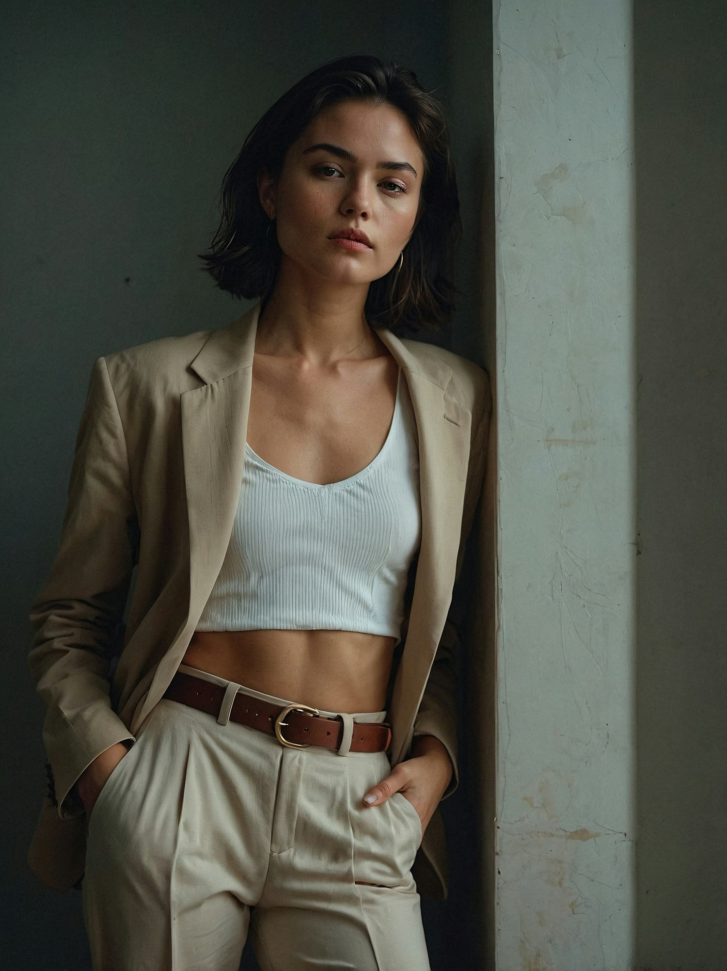 Stylish woman in beige blazer and trousers, leaning against a wall with a confident pose and neutral expression.