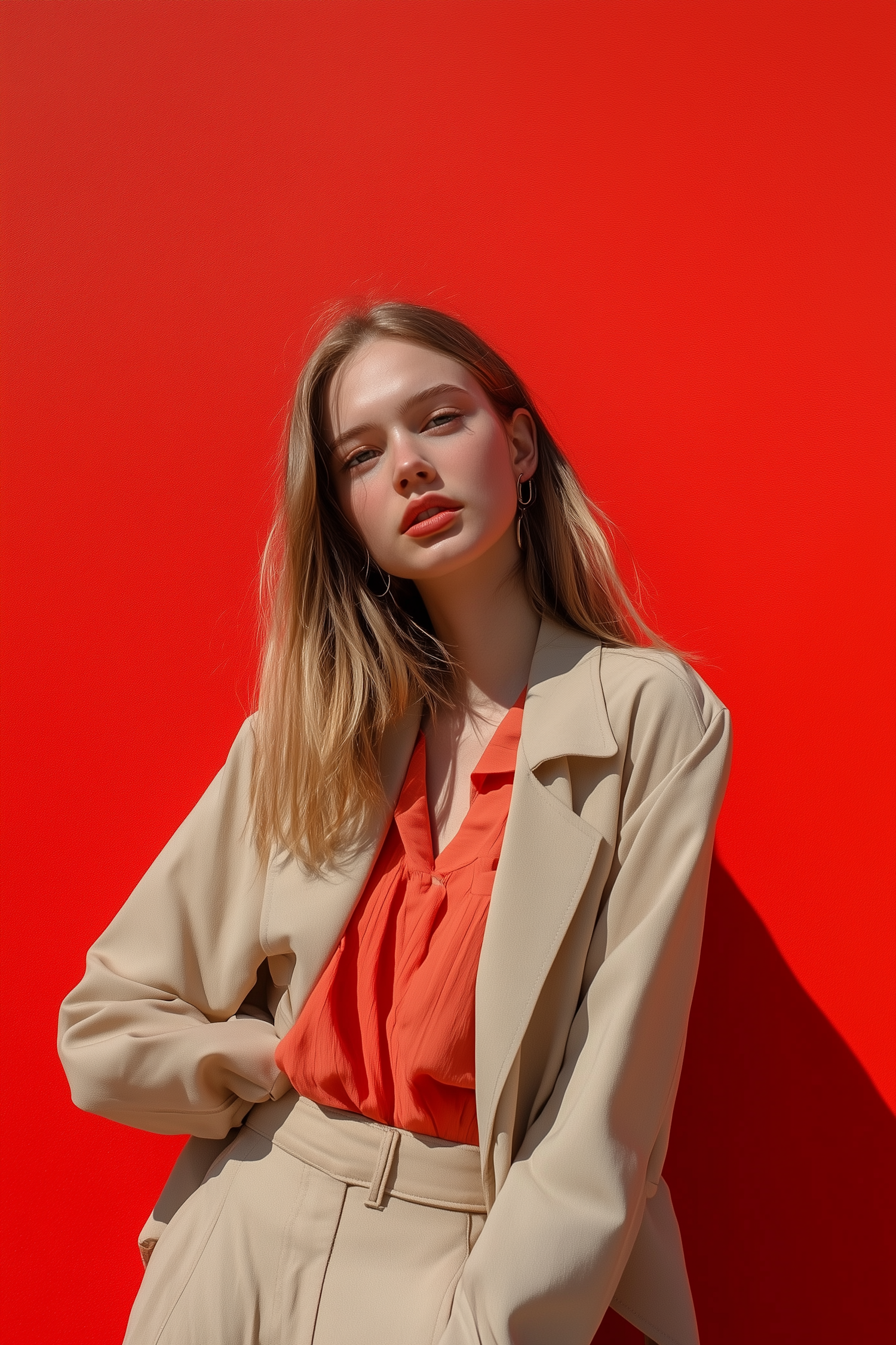 Stylish woman in beige suit and orange blouse against a bold red background, exuding confidence and elegance.