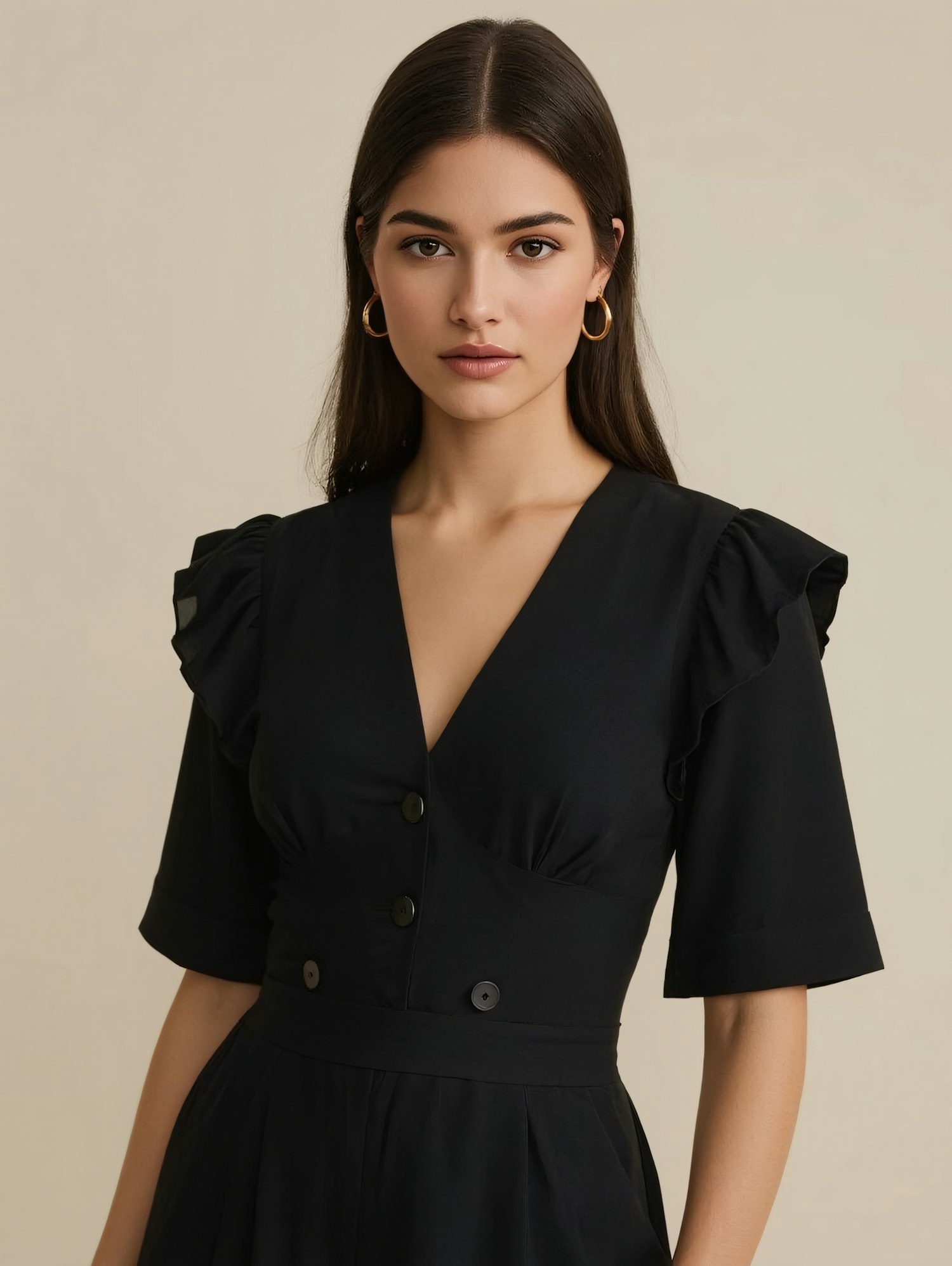 Elegant woman in a black dress with ruffled sleeves and gold hoop earrings, posing against a neutral beige background.