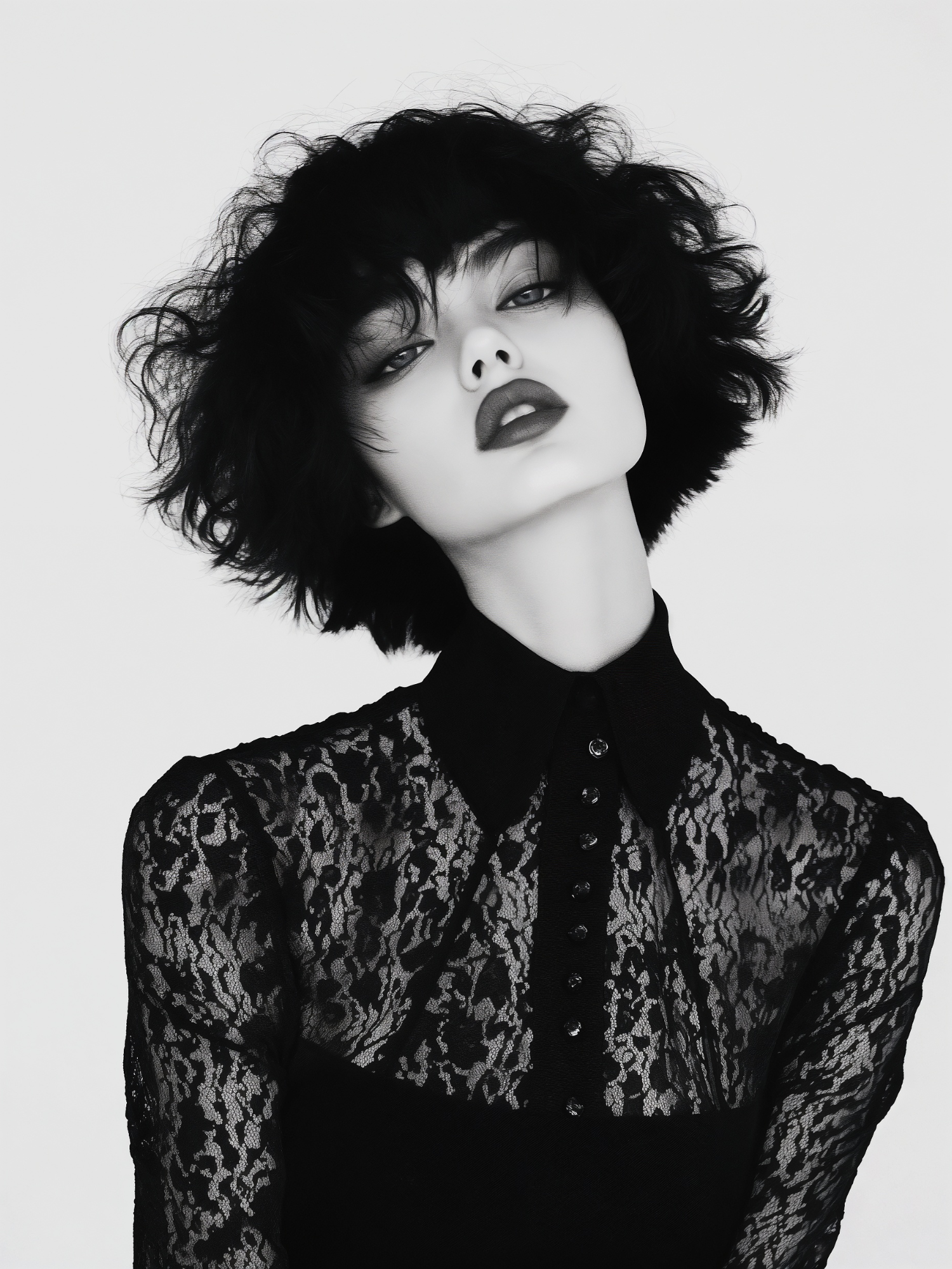 Black and white portrait of a woman with dark hair, bold makeup, and a lace top, exuding elegance and mystery.