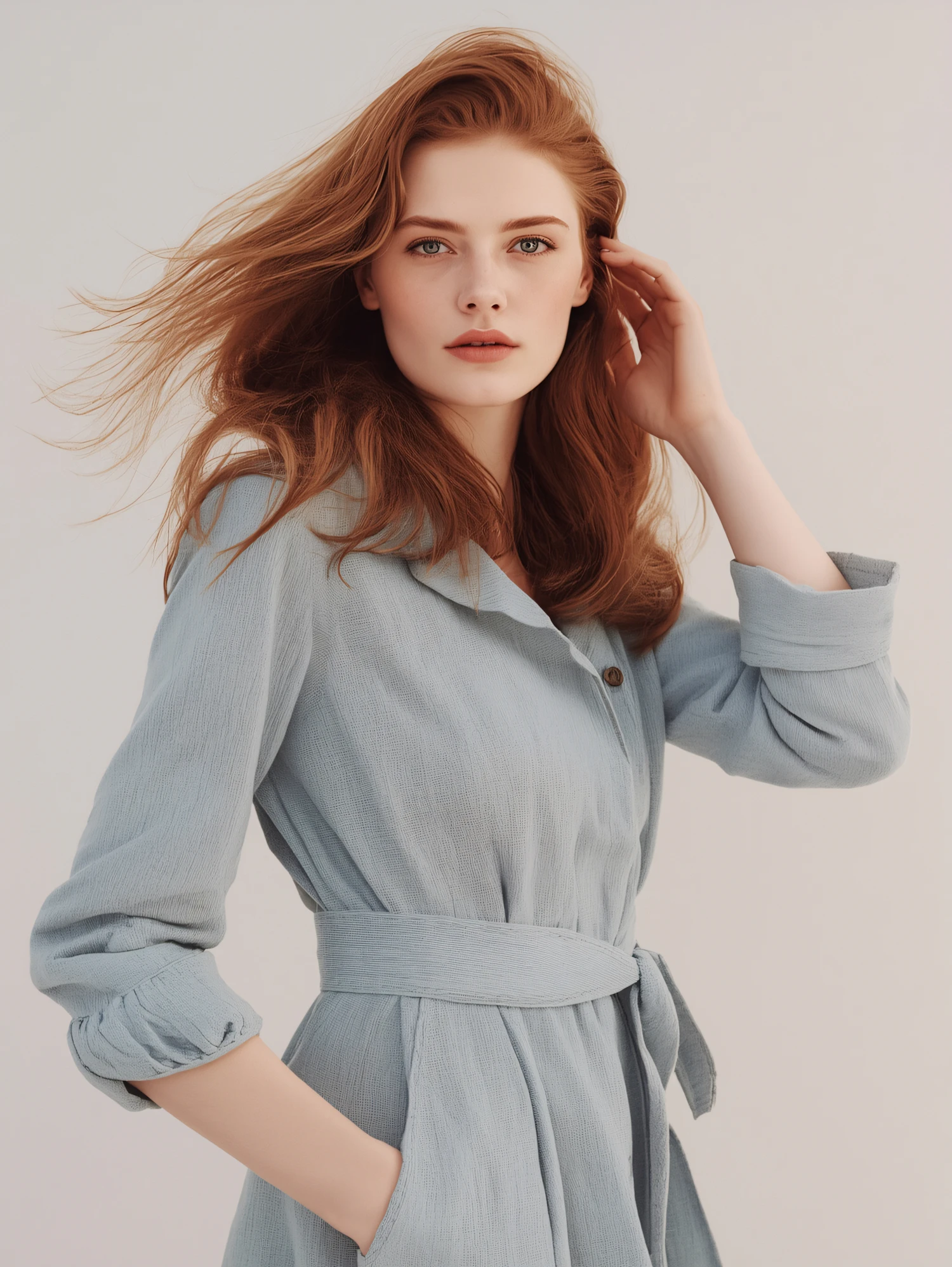 Elegant woman with red hair in a light blue dress, posing gracefully against a neutral background.