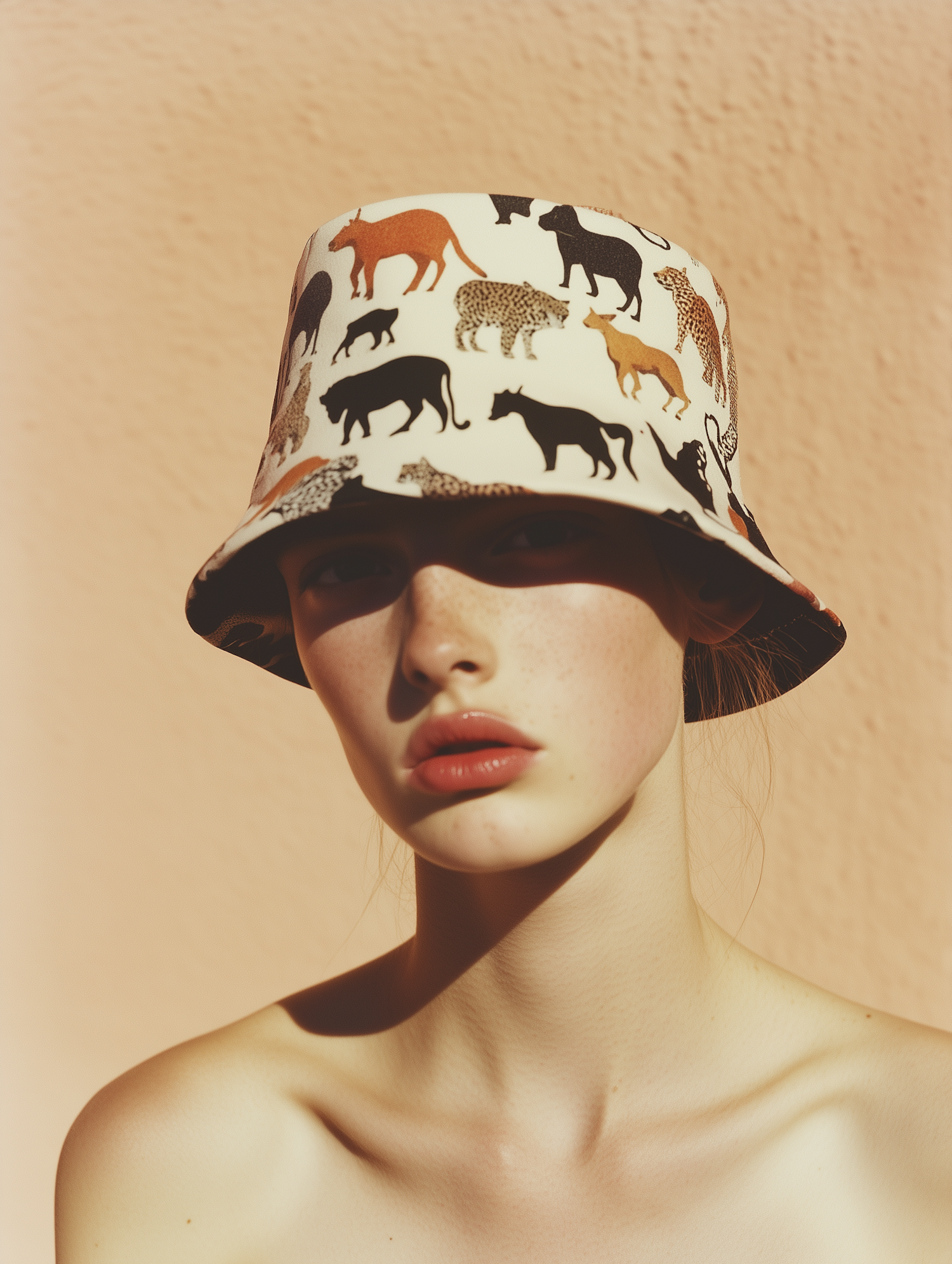 Stylish bucket hat with animal prints worn by a freckled woman against a peach wall, creating a minimalist and earthy aesthetic.
