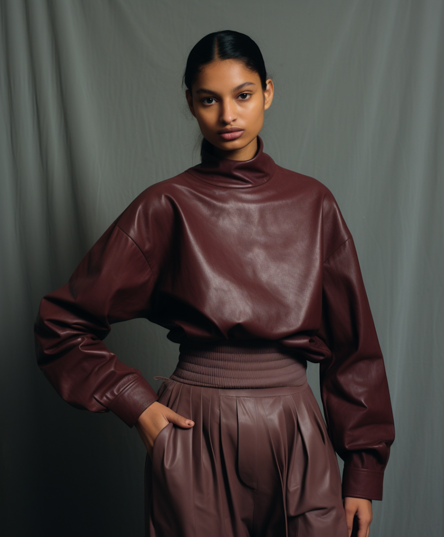 Stylish woman in burgundy leather outfit poses confidently against a gray backdrop, showcasing modern fashion elegance.