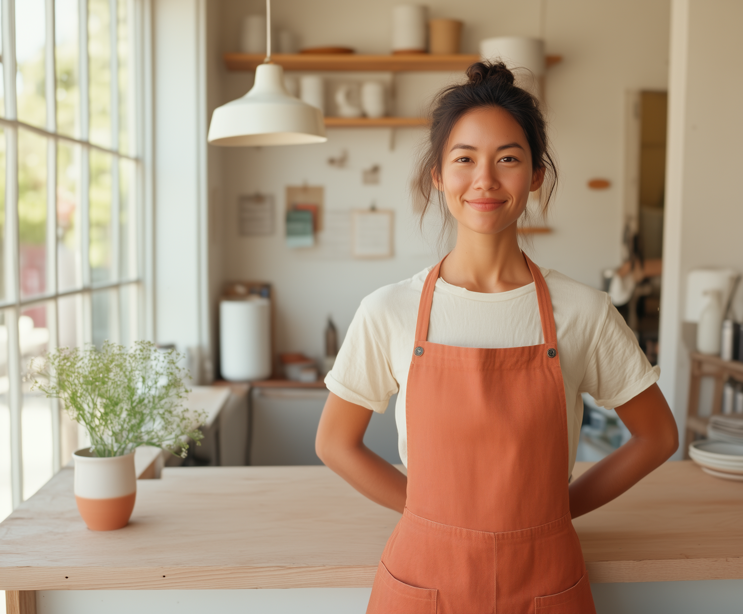 Asian woman in a cozy kitchen, wearing a rust apron and smiling warmly. Sunlight streams through a large window, creating a serene atmosphere.