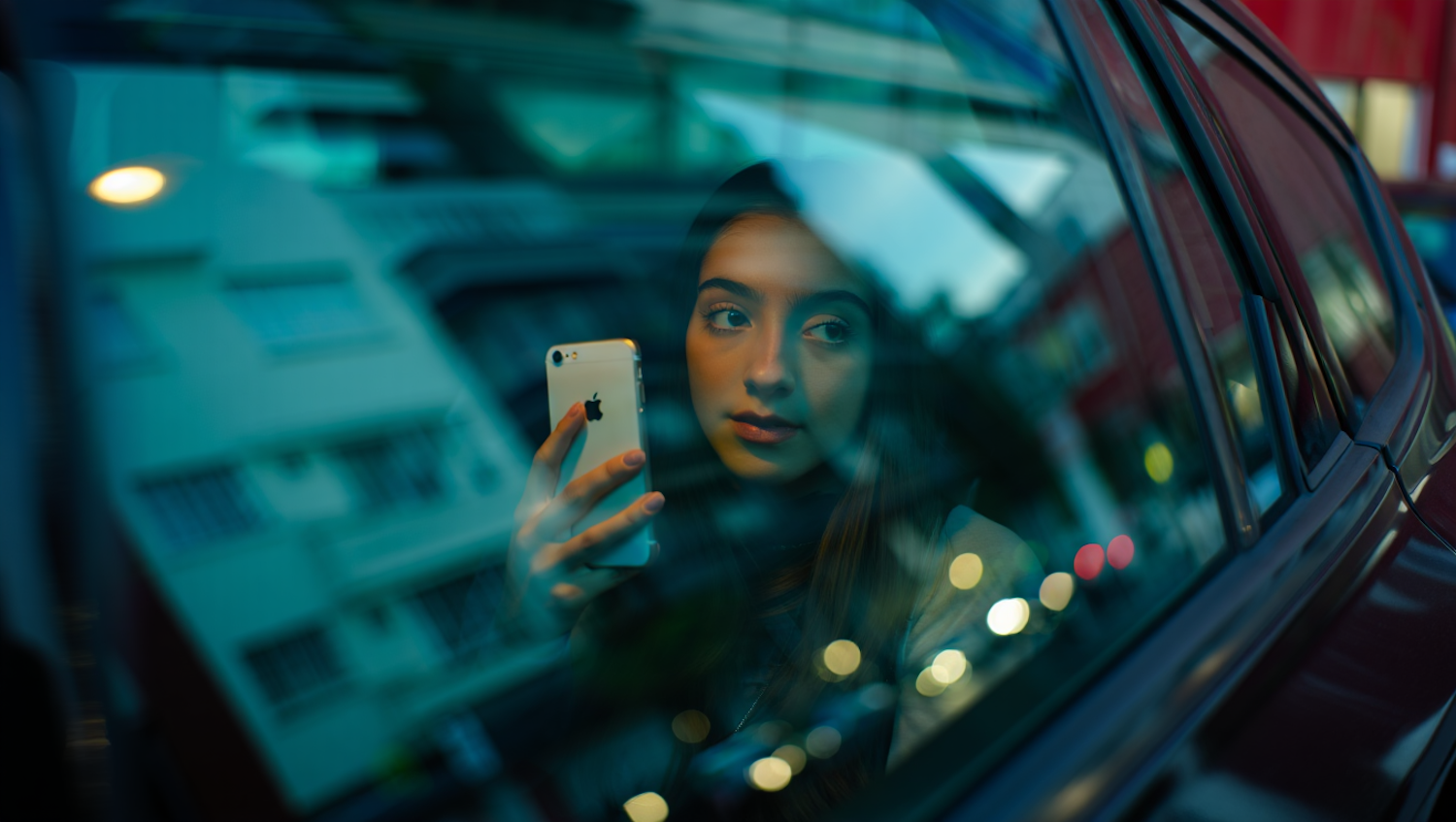A young woman holding a white iPhone gazes thoughtfully out of a car window, with urban reflections creating a moody atmosphere.
