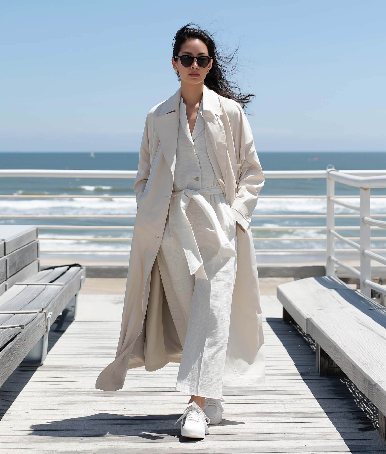 Stylish woman in beige trench coat walking on a boardwalk by the ocean, exuding confidence and elegance.