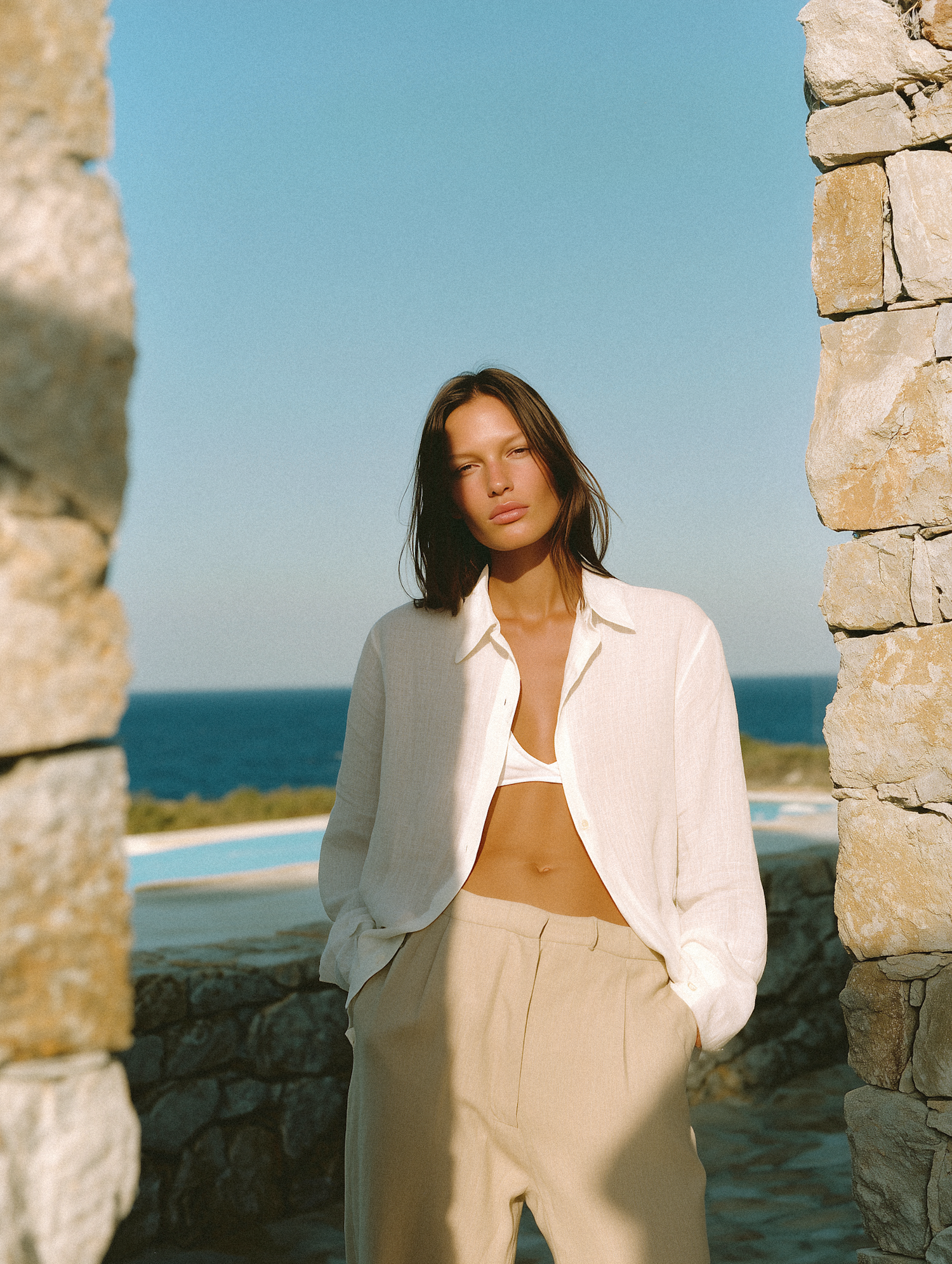 Stylish woman in a white shirt and beige trousers by the ocean, framed by stone walls and a clear blue sky.