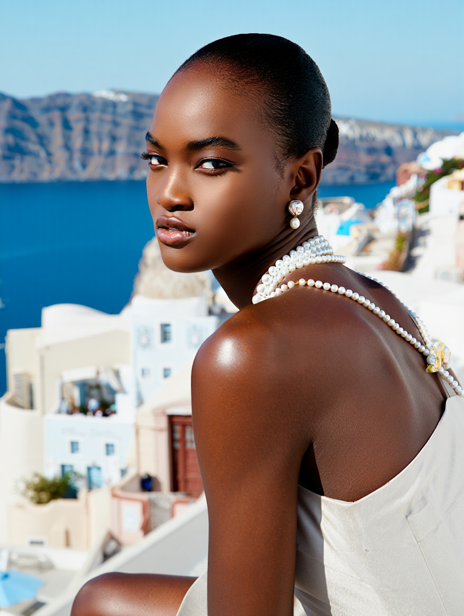 Elegant woman posing with pearl jewelry in a bright outdoor setting near blue waters and white architectural structures.