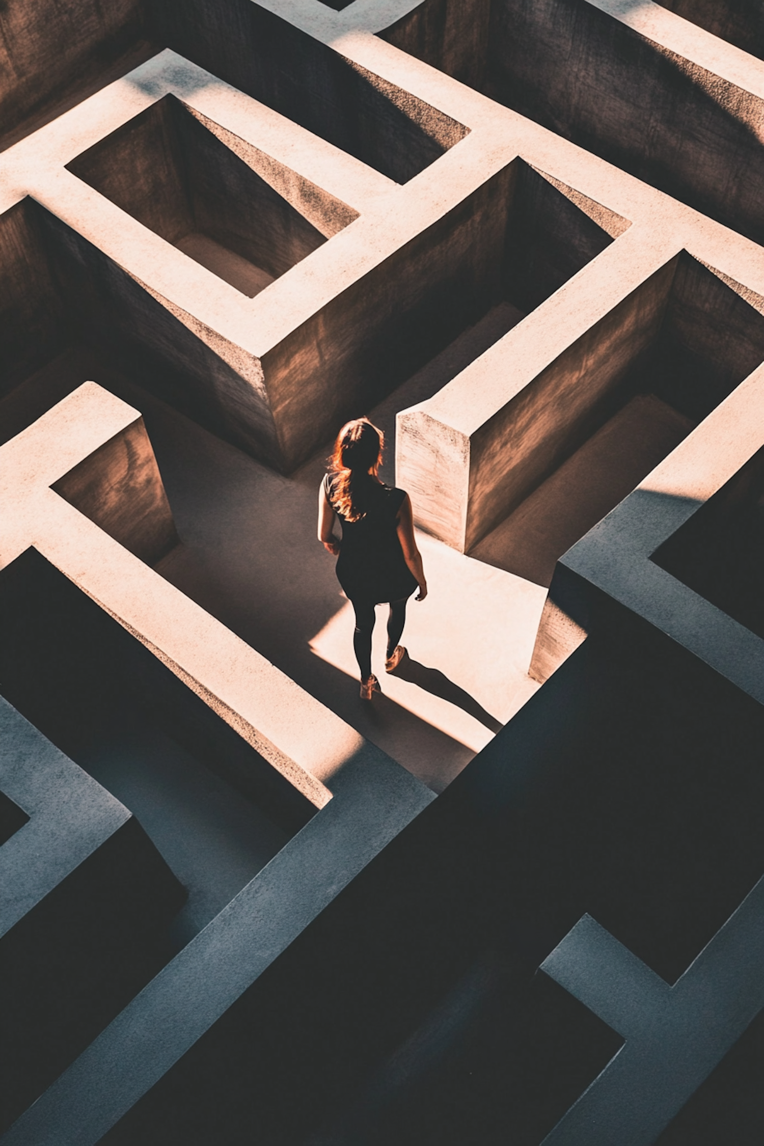 A woman walks through a sunlit concrete maze, casting a long shadow. Aerial view highlights the geometric patterns and dramatic lighting.