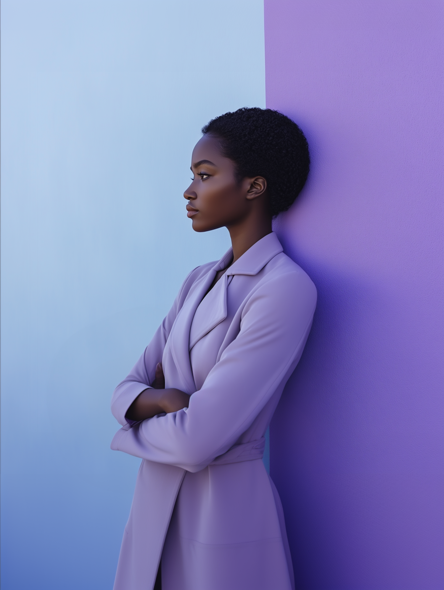 A woman in a lavender coat stands against a two-toned blue and purple wall, creating a minimalist and harmonious visual.