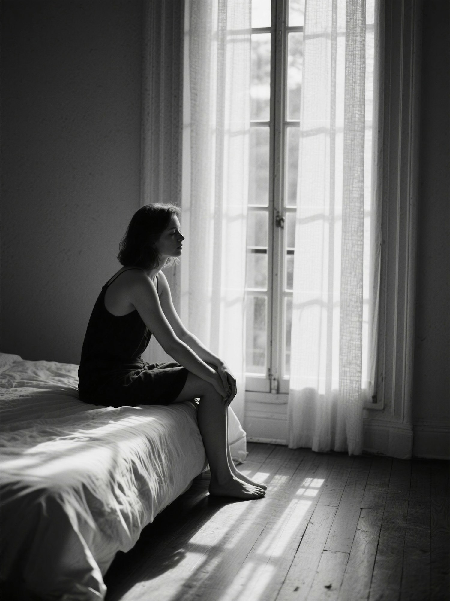 A black and white portrait of a woman sitting on the edge of a bed, her back slightly hunched, arms resting on her knees. The light comes from a tall window behind her, casting vertical lines across the floor. Her outline is soft but defined, and the grain of the photo adds a nostalgic, introspective texture. The mood is silent, slow, and cinematic.