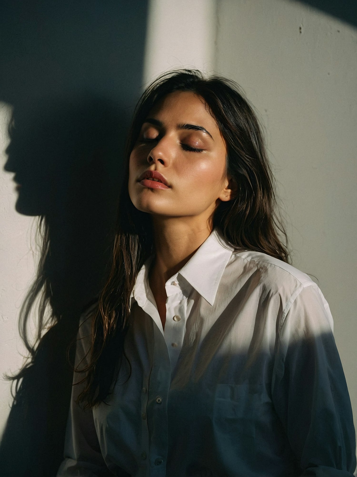 Serene woman with closed eyes in soft light, wearing a white shirt against a shadowed wall, exuding calm and introspection.