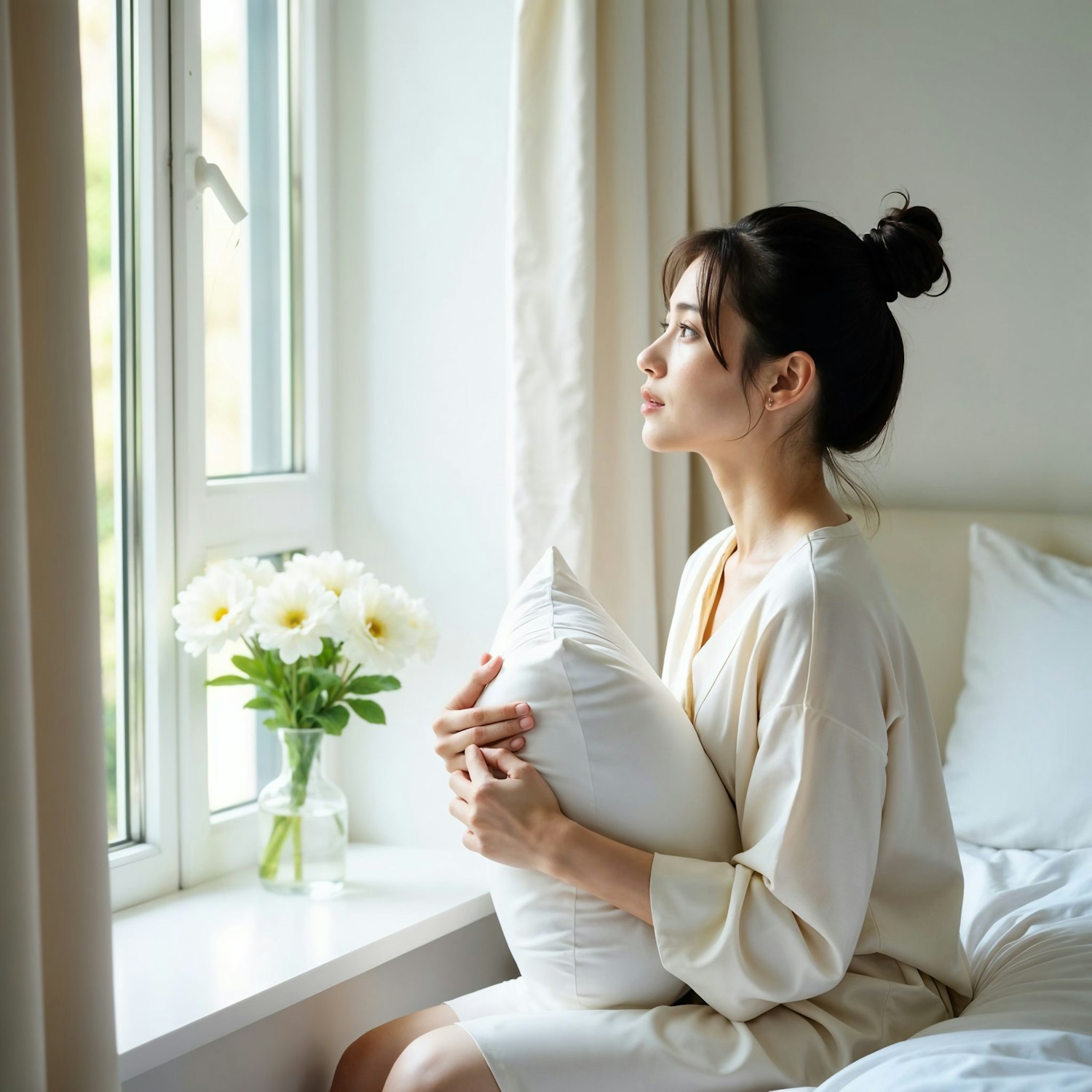 Asian woman in a cream robe holding a pillow, gazing out a window with white flowers nearby, creating a serene and peaceful scene.