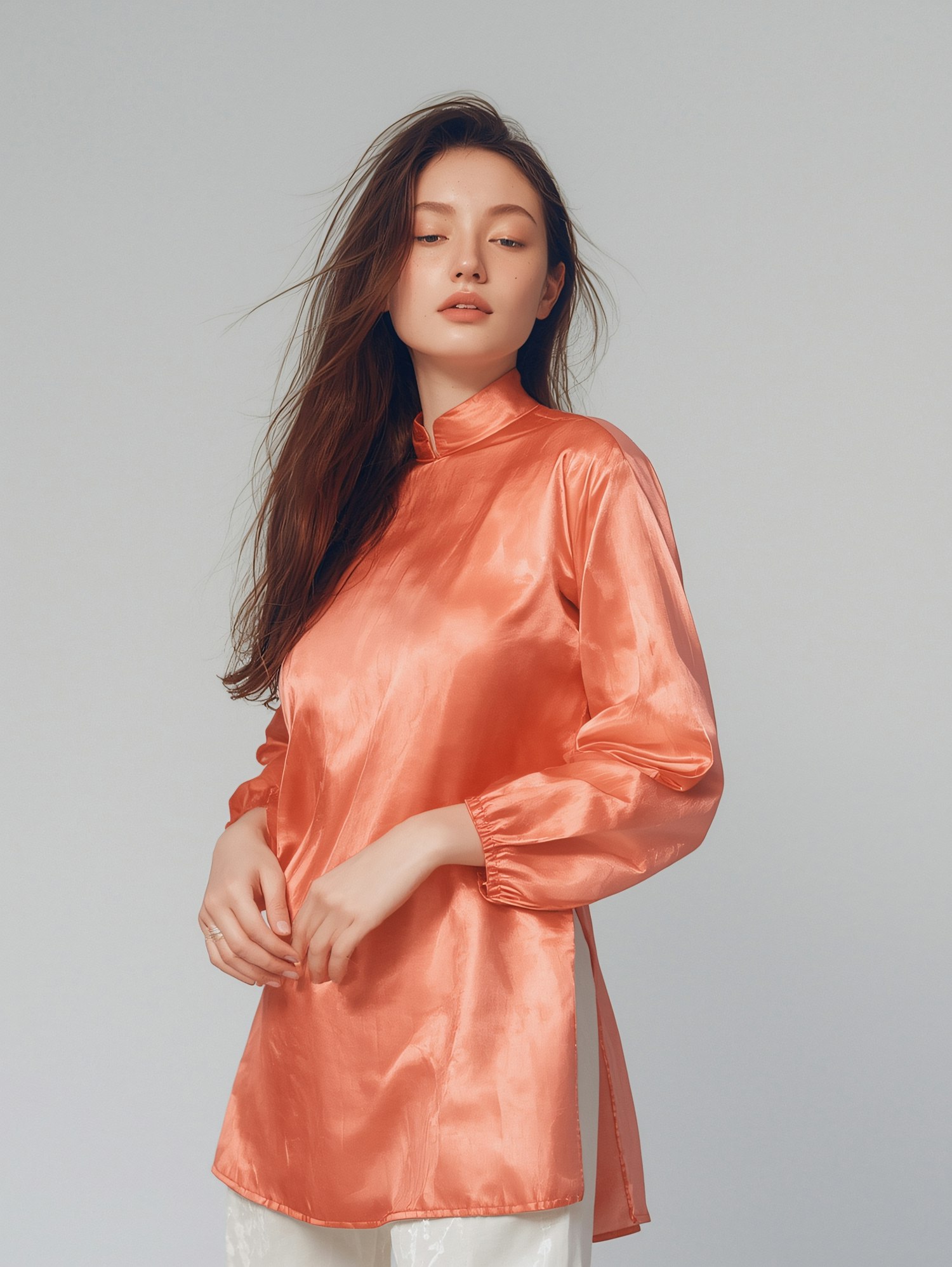Woman in a coral satin tunic with long sleeves, styled with white pants, standing against a light gray background.