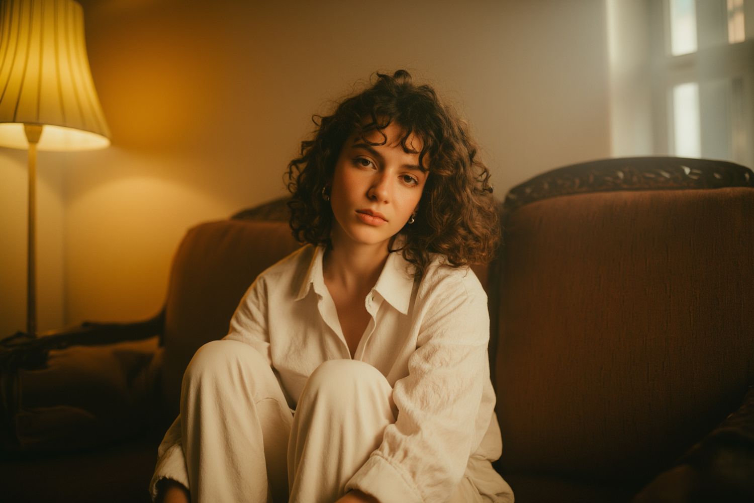 A young woman with curly hair sits on a sofa in a warmly lit room, wearing a white outfit and looking calm and introspective.