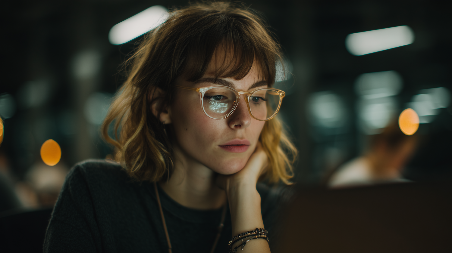 A thoughtful young woman with glasses and wavy blonde hair, focused in a softly lit indoor setting with warm bokeh lights.