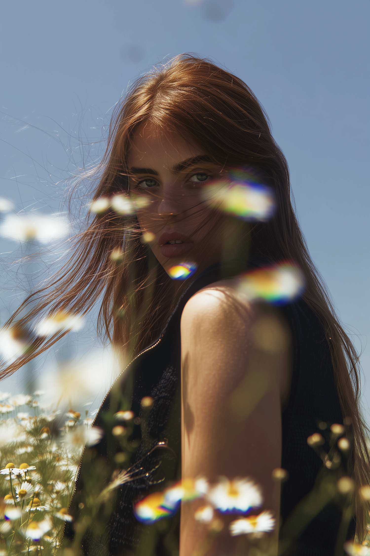 Portrait of a woman in a field of daisies under a clear blue sky, warm light and breezy atmosphere.