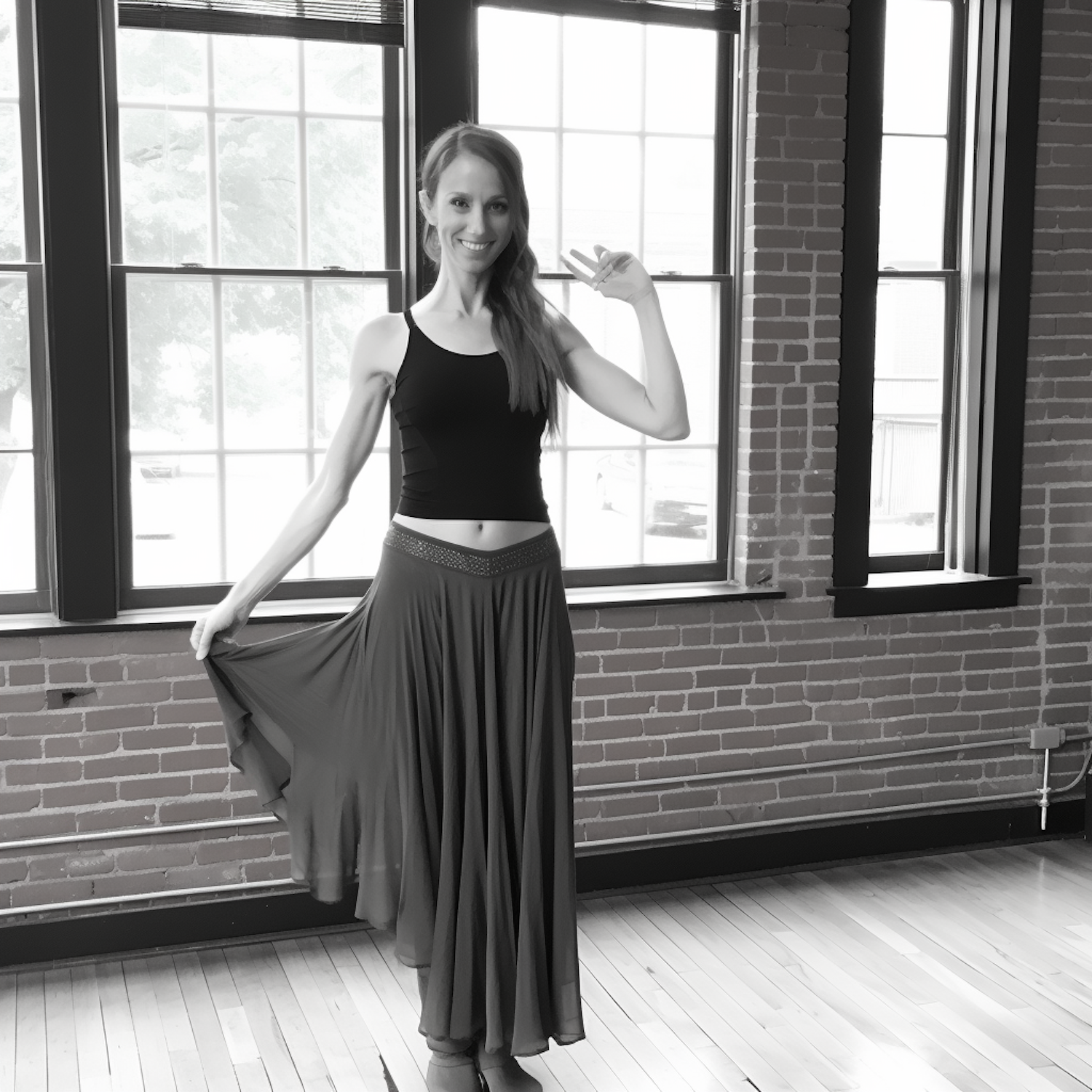 Black-and-white photo of a smiling woman in a dance studio, wearing a black top and skirt, posing gracefully with natural light.