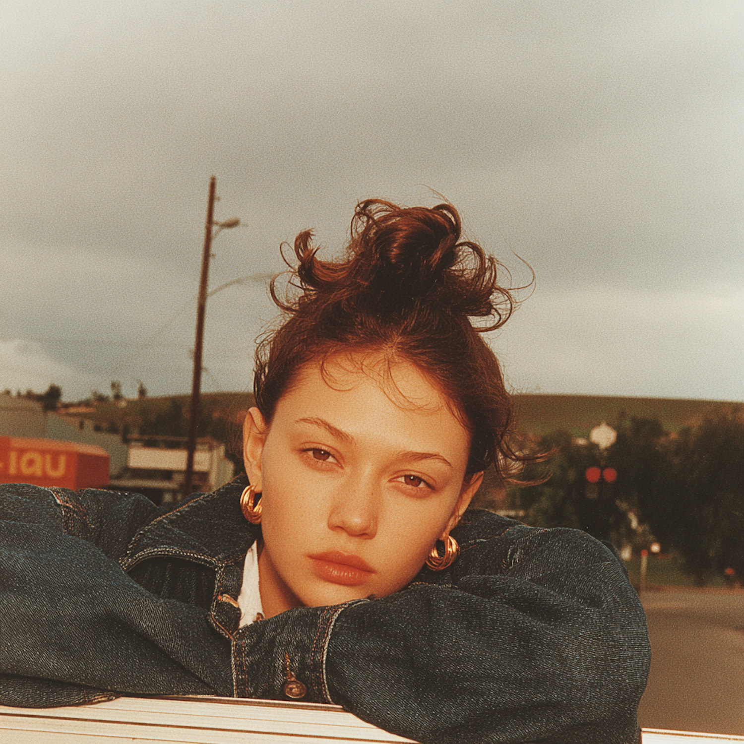 A young woman with a casual look leans on a surface, wearing a denim jacket and gold hoop earrings, with a cloudy outdoor background.