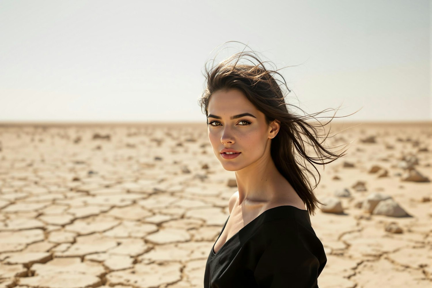 A woman in a black top stands in a desert with cracked ground, her hair blowing in the wind under a clear sky.