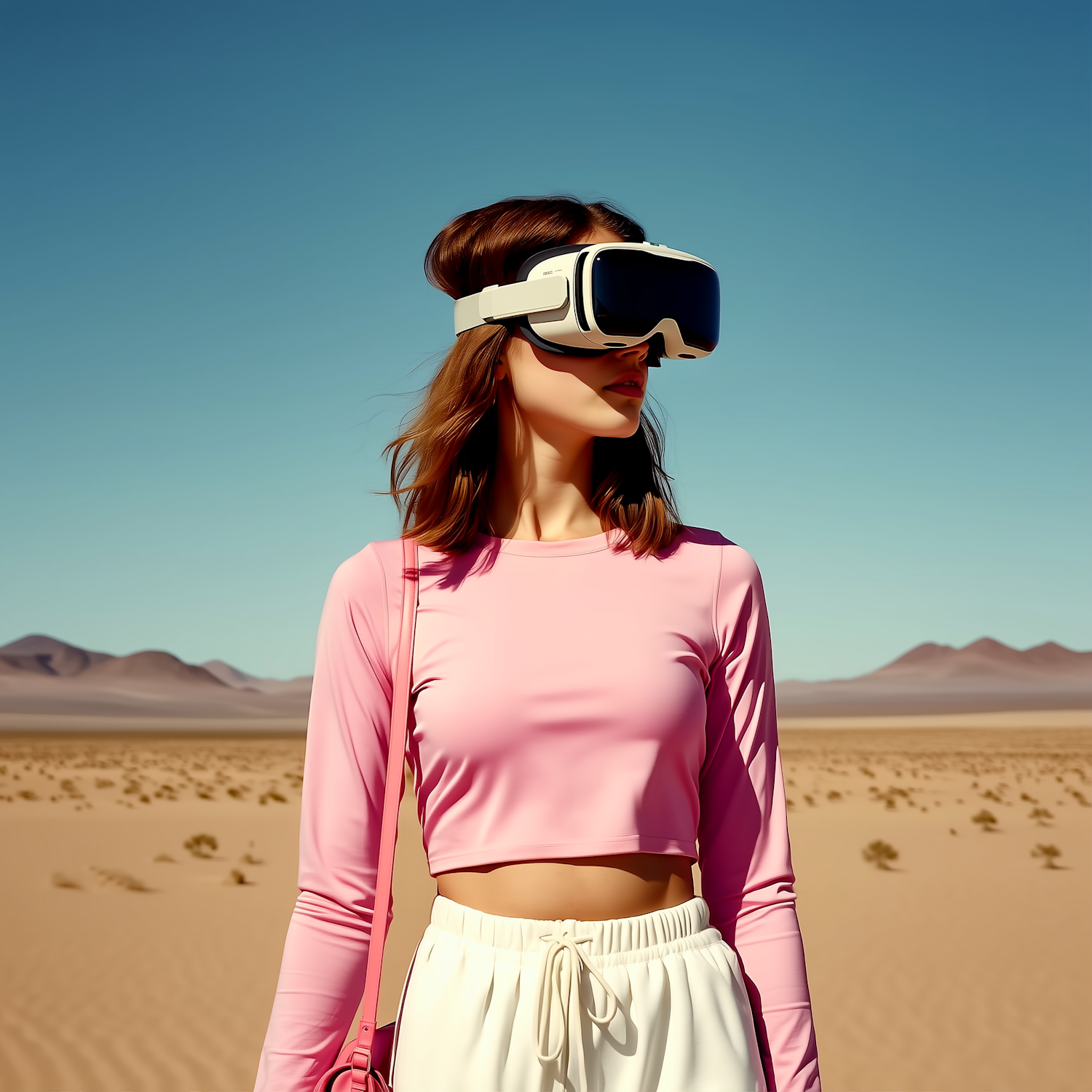 A woman in a pink crop top and VR goggles stands in a desert, blending futuristic tech with a natural landscape.