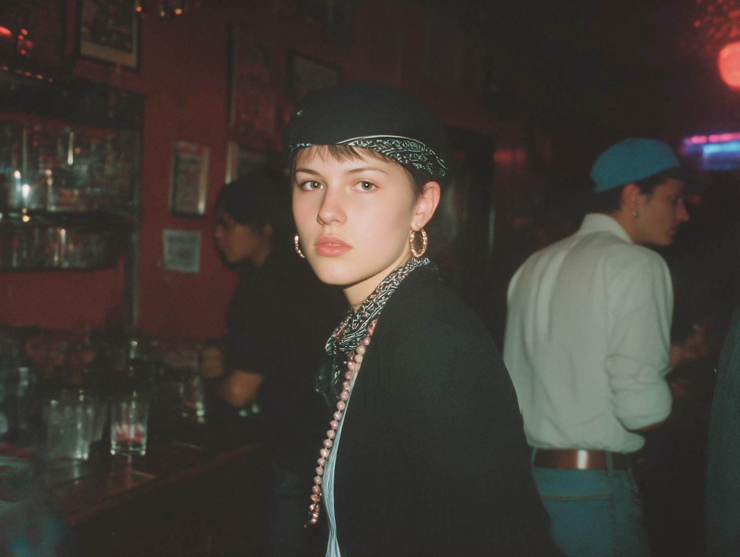Young woman in a black cap and gold hoop earrings at a dimly lit bar with red walls and a lively crowd in the background.
