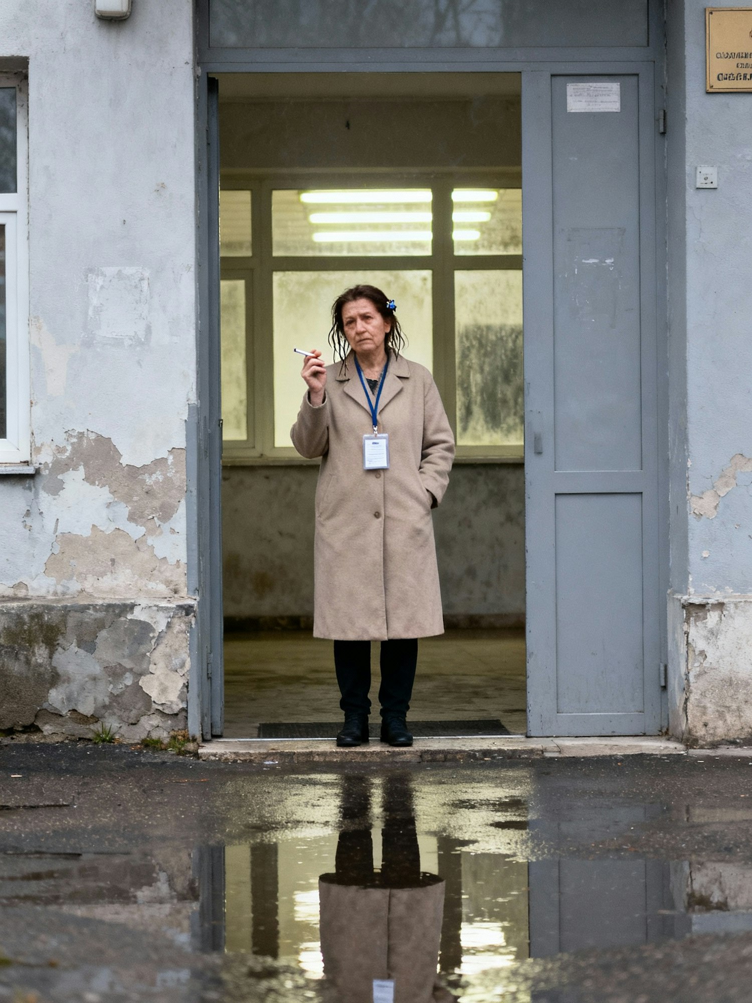 A woman in a beige coat stands in a doorway, holding a cigarette, with a reflective puddle in front of her and a worn building behind.