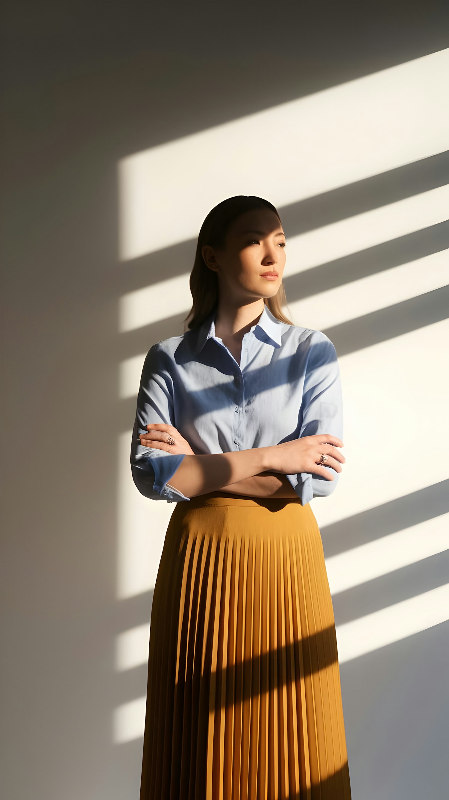 A woman in a light blue shirt and mustard pleated skirt stands in dramatic lighting with shadow patterns on the wall behind her.