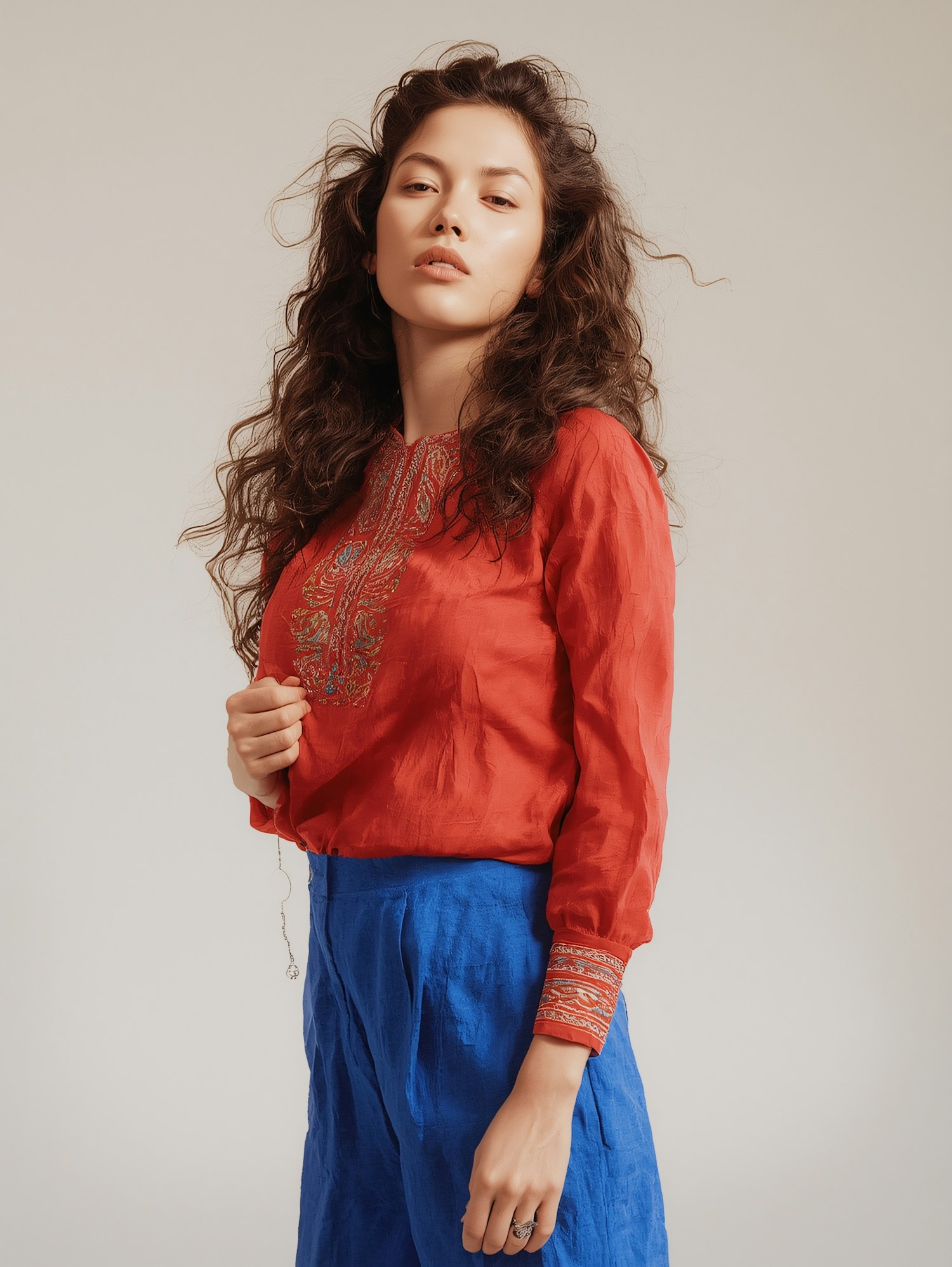 Stylish woman in a red embroidered blouse and blue pants, posing confidently against a neutral background.