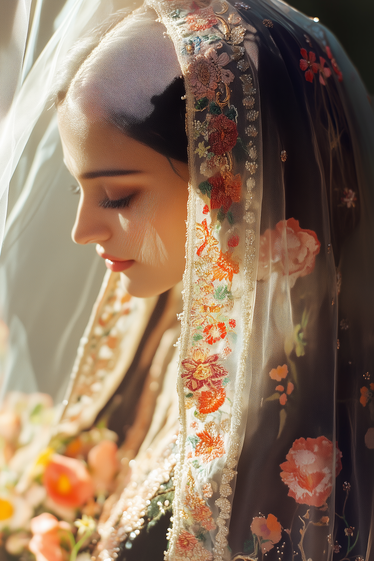 A serene portrait of a woman in an embroidered veil, bathed in soft sunlight, highlighting intricate floral patterns.