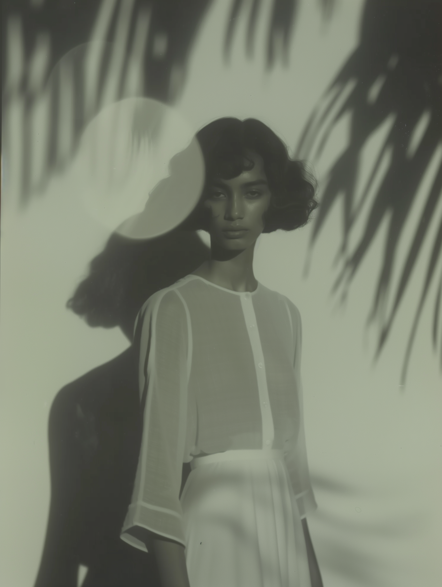 Artistic portrait of a woman in sheer blouse with palm leaf shadows, creating a serene and dramatic effect.