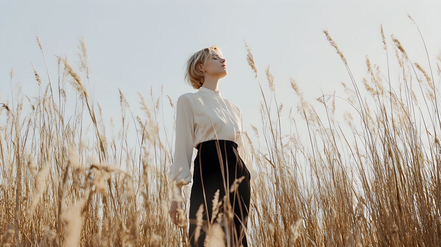 Woman in white blouse and black pants stands in tall golden grasses under a clear blue sky, exuding serenity and connection with nature.
