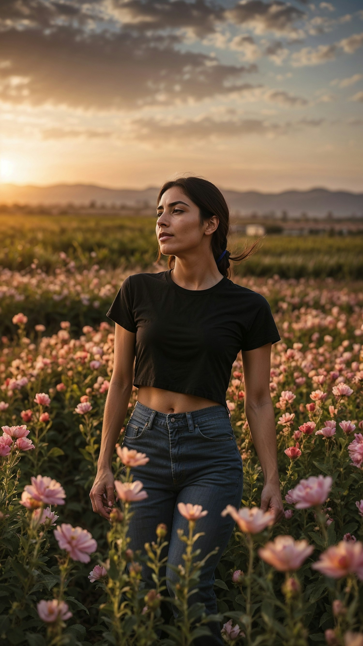 Woman in a black crop top stands in a field of pink flowers at sunset, exuding serenity and confidence.