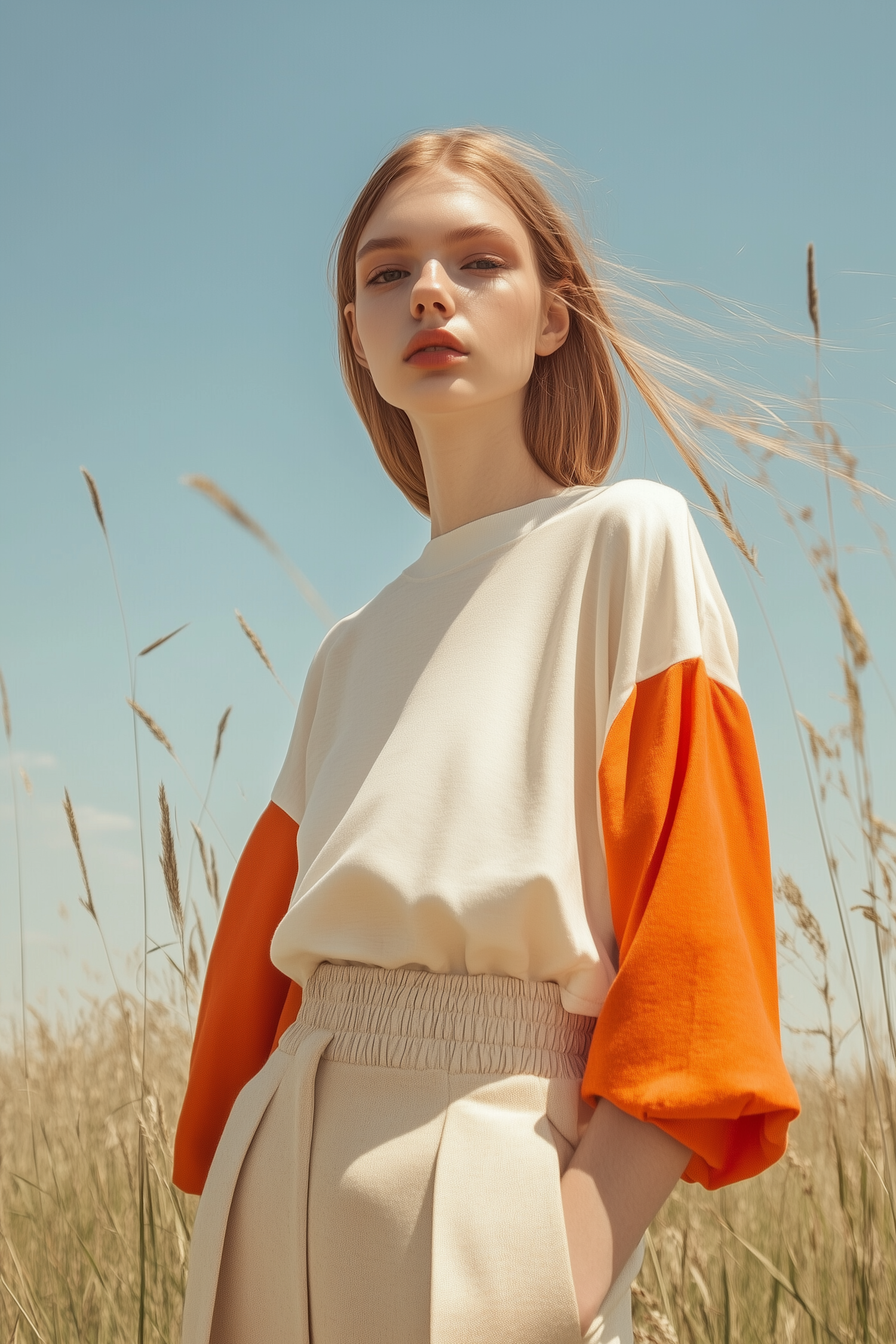 Young woman in a field wearing a white top with orange sleeves, under a clear blue sky. Blonde hair flows gently in the breeze.