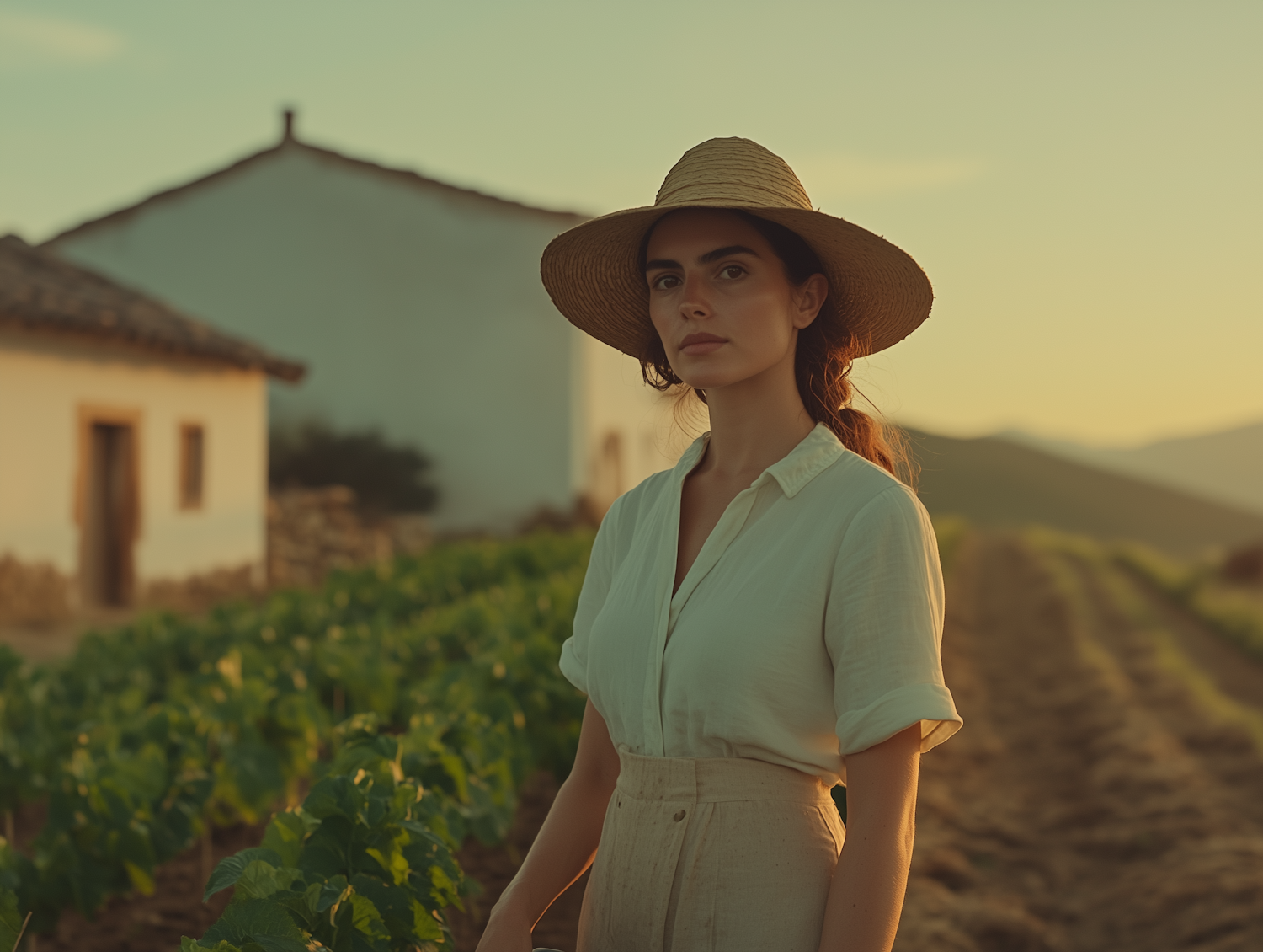 Woman in straw hat stands in sunlit field with vineyard and rustic building, bathed in warm golden light.