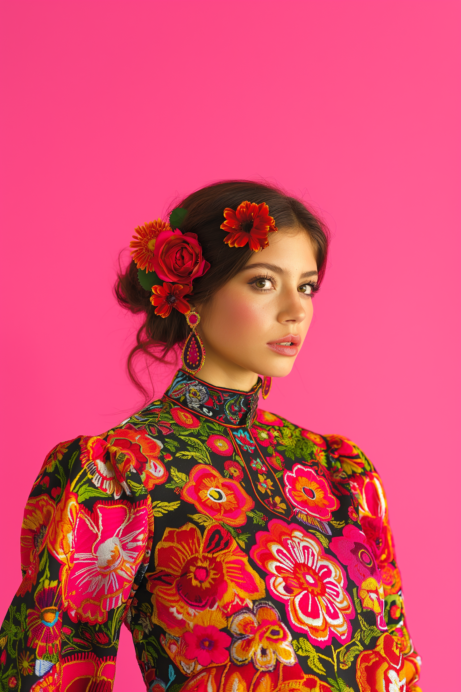 Young woman in vibrant floral dress with red flowers in hair against a bright pink background.