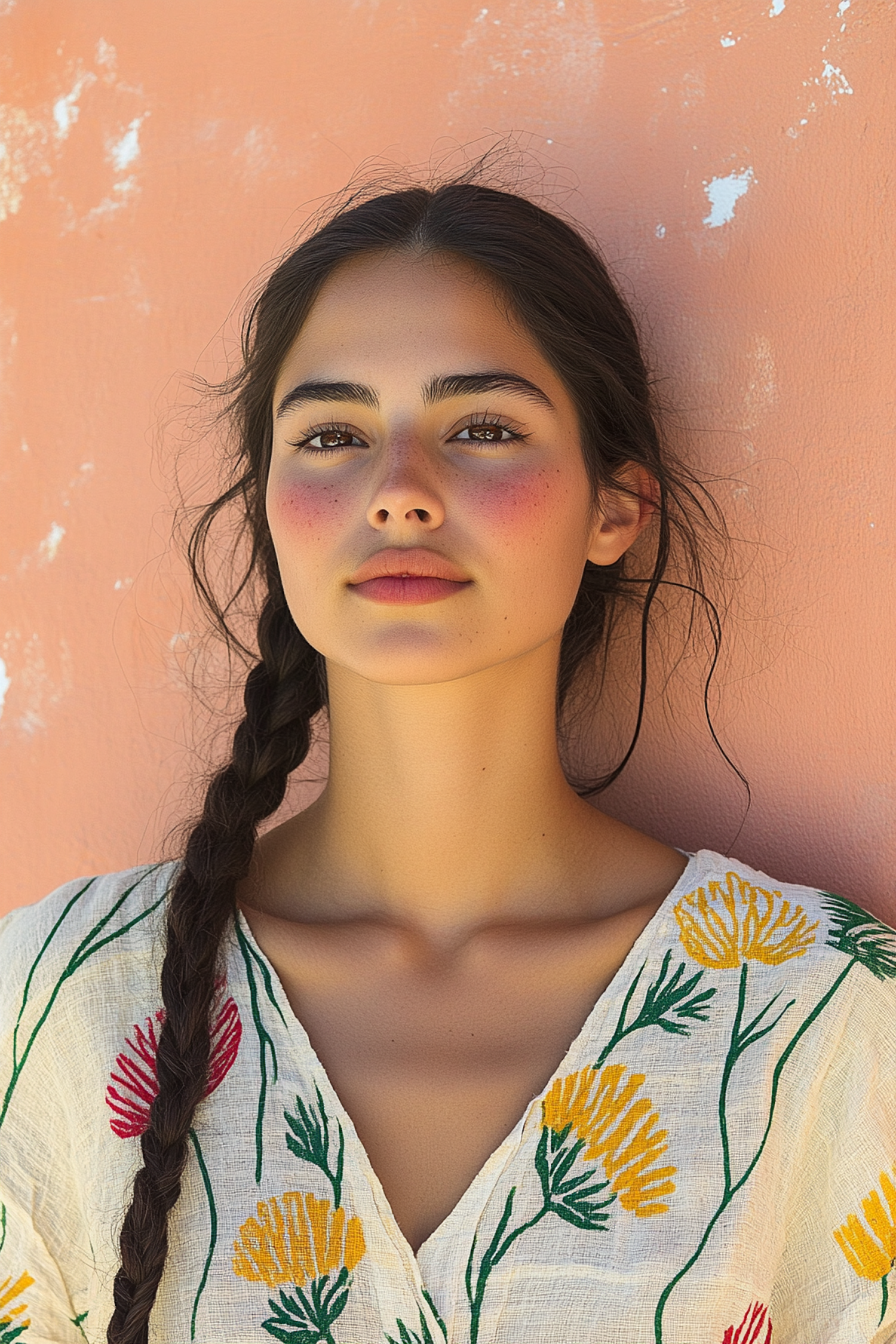A serene portrait of a young woman with a braided hairstyle, wearing a floral embroidered blouse against a peach wall.