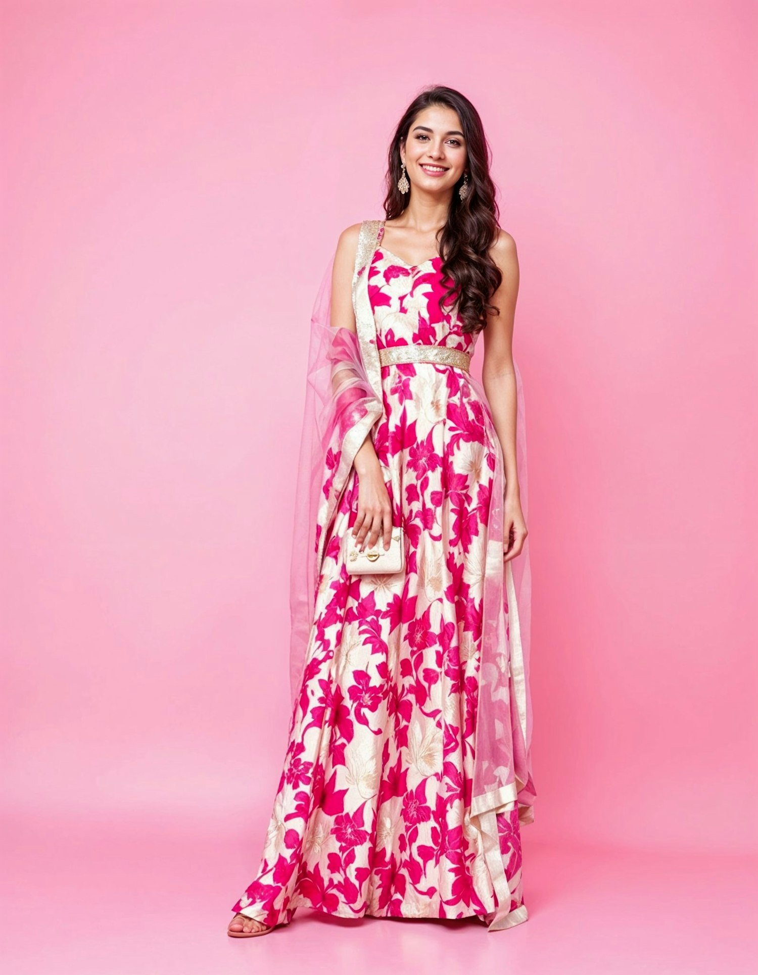 Elegant woman in a pink floral gown with a sheer dupatta, holding a clutch against a pink background.