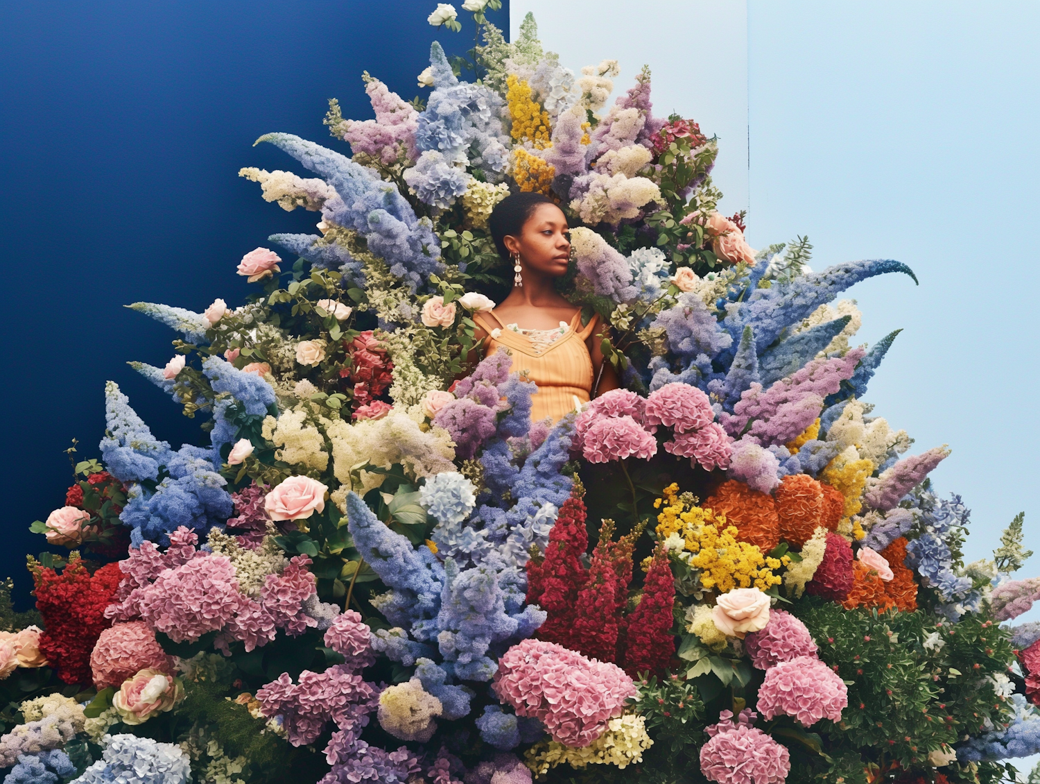 A woman in a floral arrangement with vibrant colors and a serene expression, set against a blue gradient background.