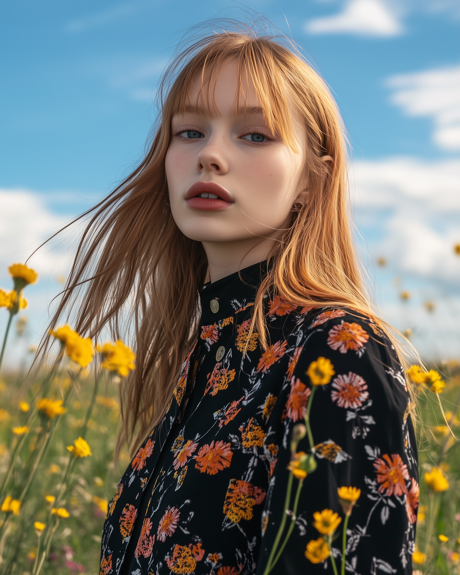 Young woman with light brown hair in a floral dress stands in a field of yellow flowers under a blue sky.