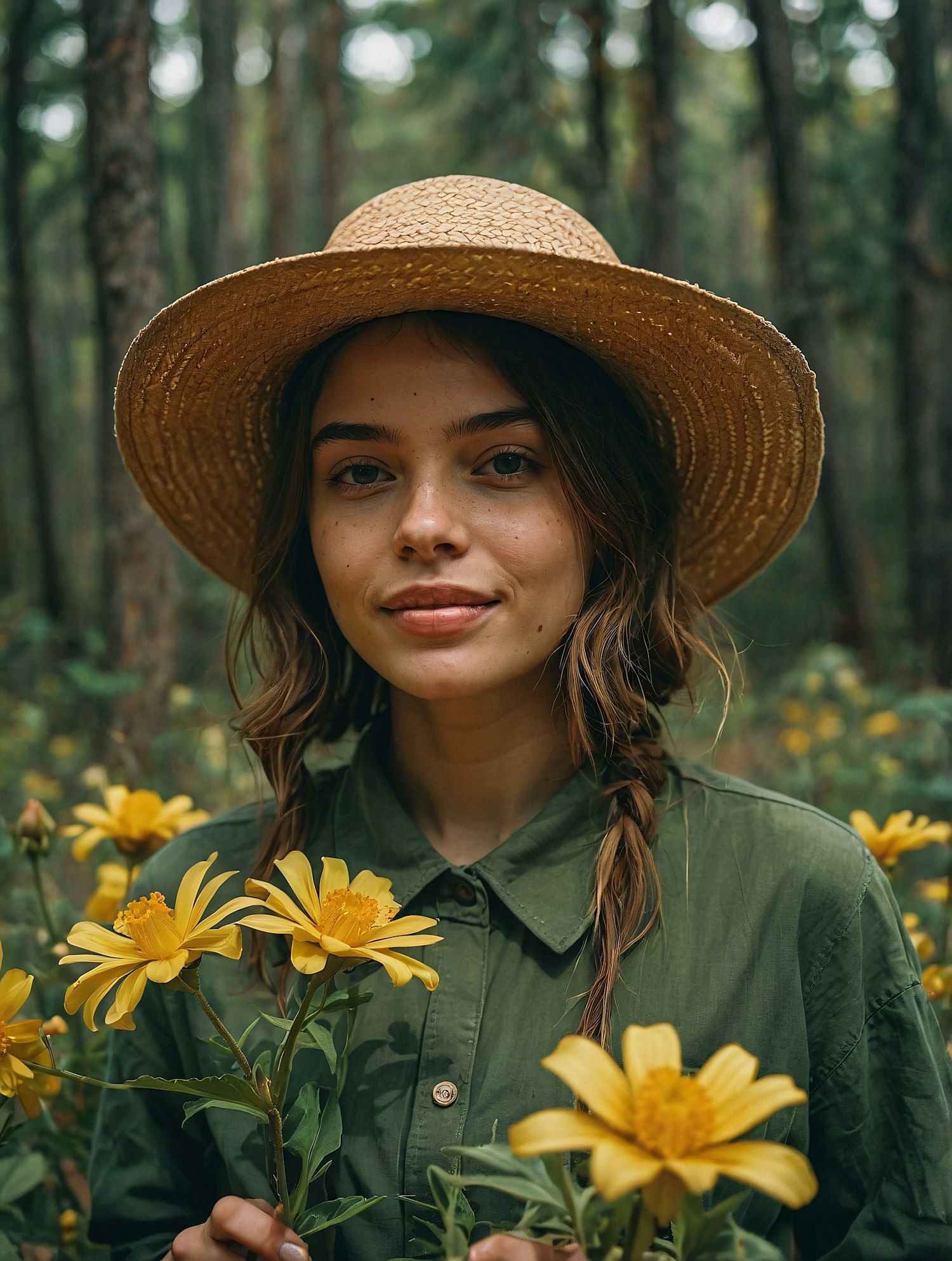 Young woman in a straw hat amidst yellow flowers in a forest, wearing a green shirt and smiling gently.