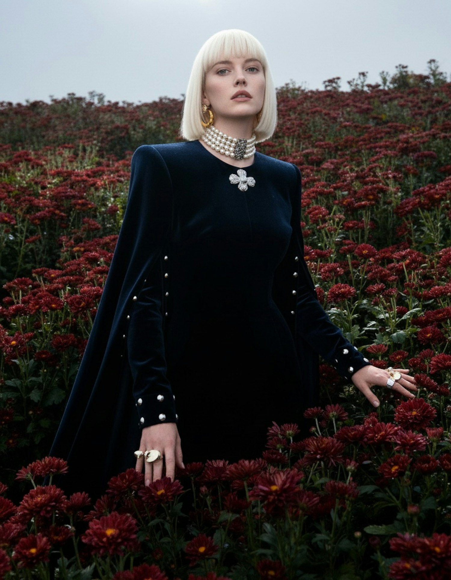 A stylish woman in a velvet dress and pearl jewelry stands in a field of red flowers under an overcast sky.